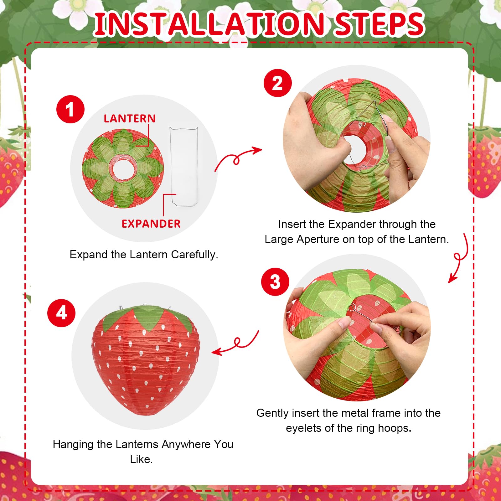 6pcs Lanternes en Papier 3D Fraise Rouge Lanterne à Fruits Suspendues Ornements pour Chambre D'enfant, Toile de Fond D'anniversaire Mariage Décorations de Fête sur Le Thème Des Fruits Description : Nom : Lanterne en papier à la fraise Matériau : papier Taille : 20cm(7., 9 inches), 30cm(11., 8 inches) Poids : 30g(1., 1 oz), 50g(1., 8 oz) Le paquet comprend : 6 x lanternes en papier aux fraises Décoration sur le thème des fruits : ces lanternes en papier sont en forme de fraise, avec des couleurs vives, très belles et attrayantes. Ils ont créé un effet visuel cool pour votre fête, créant une atmosphère de ferme joyeuse qui impressionnera profondément vos invités Vous pouvez accrocher ces lanternes en papier à la fraise au plafond, aux fenêtres, aux portes ou à tout autre endroit où vous en avez besoin. Lanternes En Papier Aux Fraises - Décorations De Fête 3D Sucrées Largement utilisées : Ces adorables lanternes en papier à la fraise conviennent parfaitement à diverses décorations DIY, telles que les décorations de fête de bébé sur le thème de la fraise, le mariage en forêt, la décoration de chambre, la fête d'anniversaire, la fête de thé en intérieur ou en extérieur, etc. Accès, horaires, tarifs : tout ce qu'il faut savoir sur le Festival des... Icône De aise Mignonne Vecteur PNG , aises 3d, Icône De aise Après utilisation, les lanternes en papier peuvent être retirées, pliées, mises à plat et empilées pour une réutilisation ultérieure. Matériau fiable : Ces lanternes en papier sont fabriquées en papier, qui est assez solide et ne se déforme pas facilement, et peut être utilisé pendant une longue période.