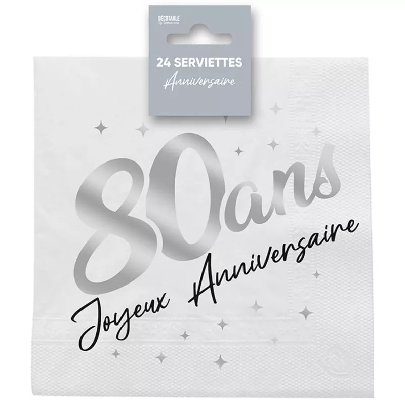 20 serviettes blanches Happy Birthday or Pour vos 80 ans adoptez cette serviette blanche avec décors argent pour décorer votre table d'anniversaire. Pour un anniversaire chic, choisissez ces serviettes 80 ans en papier pour compléter votre décoration d'anniversaire. Accorder avec assiettes, gobelets et chemin de table du même thème ! Les serviettes mesurent 12.5cm x 12.5cm (petit format). Détail technique : ♦Référence produit : 6159 ♦Disponibilité produit : commandez avant 15h départ le jour même ♦Matière : papier 3 plis... Conditionnement: 1 Paquet de 20 serviettes anniversaires., Taille: 16., 5cm x 16., 5cm (fermé) / 33cm x 33cm (ouverte) surprisez Serviette de Table Anniversaire Blanche et Noire 80 Ans (x20) R/5241 : : Cuisine et MaisonRetours & garanties légales: Demandez le retour d’un produit jusqu’à 14 jours après sa réception, sans motif, pour obtenir un remboursement complet (prix et frais de livraison) au titre du droit légal de rétractation. permet en plus les retours jusqu’au 30ème jour... Serviette De Table Blanche 8 Ballons Blanc Et Noir Joyeux Anniversaire 80 Ans 23 Cm Serviette De Table Noire Conditionnement: 1 Paquet de 20 serviettes anniversaires. Couleur: Blanc et noir., Epaisseur: 3 Plis., Matière: Papier.