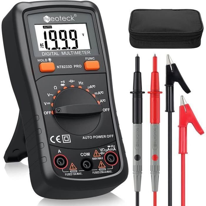 1 manuel d'utilisation (français non garanti). 【Détection de tension NCV sans contact plus sûre】 La sonde NCV permet une détection de tension sans contact. Mesure de la tension CA domestique : avec une plage de mesure de 198 V-240 V, ce multimètre mesure avec précision la tension CA domestique. Lorsque la valeur... Il émet des alarmes sonores et visuelles lorsqu'il est à proximité d'une alimentation AC, ce qui rend l'utilisation plus sûre. Tension CA : 0,8-600 V (plage : 610 V)., Résistance : 600 Ω., Nombre : 2000 comptes., NCV : √. 【Mesure précise de la tension alternative domestique】Avec une plage de tension de 198 V à 240 V, ce multimètre fournit des mesures précises de la tension alternative dans la maison. *Écran LCD : il dispose d'un écran rétroéclairé lorsque vous travaillez la nuit. Lorsque la valeur mesurée est inférieure à 50 ohms, le buzzer retentit et le voyant vert indique le passage. Contenu de l'emballage: 1 instrument., 1 stylo de table. Multimètre - YOSOO - HT123 - Test intelligent - Utilisation simple... Écran LCD rétroéclairé et coque de protection en caoutchouc : l'écran LCD offre des lectures claires et dispose d'un rétroéclairage pour travailler dans des conditions de faible luminosité. Multimètre Numérique - CIKONIELF - HT123 - 4000 Comptes - Test Sans Indicateur de batterie faible: √ Arrêt automatique : √. Caractéristiques techniques : Tension continue : 0,8 ~ 600 V (plage : 610 V). Si la valeur mesurée est de 220 V, la précision est garantie. Stockage des données : √ Rétroéclairage : √., Lampe de poche : √. Multimètre Numérique Multimu00e8tre Numu00e9rique Trms 2000