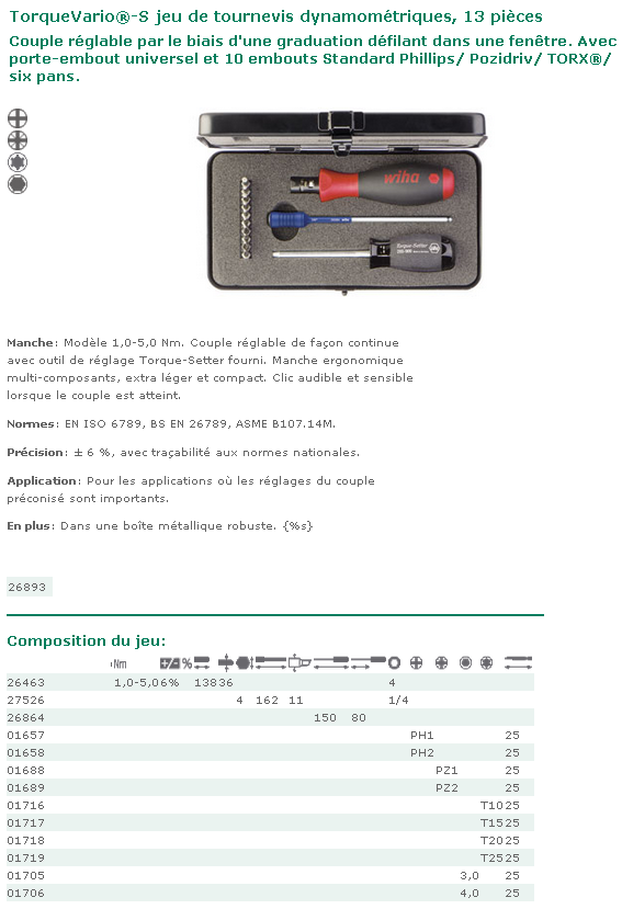 Le porte-embout magnétique de 6,35 mm assure des échanges rapides et sécurisés pour vous permettre de travailler sans interruption Jeu de tournevis dynamométriques 250 cNm | Hoffmann Group Sens de serrage: Serrage à droite Précision de mesure du couple: ±6 Logement pour embouts: D 6,3 Certificat d'étalonnage: Certificat d'étalonnage du fabricant Toutes les informations sur l'article Ajouter à la liste d'articles Partager l'article Catalogue interactif Détails du produit Description Téléchargements et documents... Tournevis Dynamometrique Jeu De Tournevis Dynamométriques Numériques, Tournevis Tournevis Electricien Dynamométrique Que vous soyez amateur ou technicien, ce tournevis dynamométrique numérique offre fiabilité et confort à chaque tour TOURNEVIS,Black--Jeu de tournevis multifonctions 115 en 1 pour la... Polyvalence tout-en-un : le jeu de clés dynamométriques numériques comprend 30 embouts S2 et 5 douilles, prêt à être utilisé dans l'assemblage électronique, la réparation de machines, l'entretien de bricolage et les ateliers professionnels. Construction durable pour un usage quotidien : conçu avec un design robuste et ergonomique pour une utilisation prolongée sans fatigue. Prend en charge plusieurs unités : Nm, in-lb, ft-lb et kg-cm Le tournevis dynamométrique est utilisé pour visser une grande variété de vis avec un couple fixe, par exemple pour les travaux d'assemblage industriel ou le vissage d'inserts indexables. 943132689300