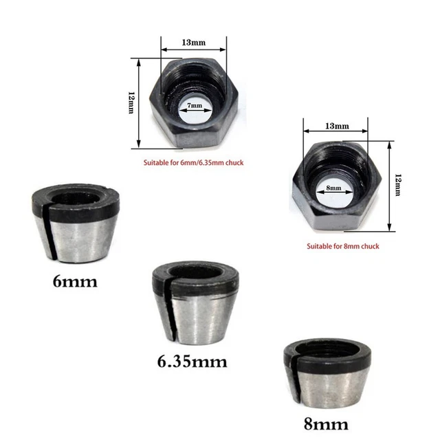 Cpolebev Spécification:Taille du mandrin: 8 mm, 6,35 mm, 6 mm (0,31 pouce, 0,25 pouce, 0,24 pouce)Couleur: noir + argentMatériel: acierContenu de l'emballage:3 x gravure d'adaptateur de mandrin de pinceSeul le paquet ci-dessus, les autres produits ne sont pas inclus. Ce sont des convertisseurs à douille fendue à des fins multiples de sutabilité du mandrin ou de la pince. Accessoires Pour Défonceuses 6pcs Routeur Embout Pince Mandrins Ce sont des convertisseurs à douille fendue à des fins multiples de sutabilité du mandrin ou de la pince. Utilisé pour la conversion de mandrin de machines de coupe et de gravure. 3 x gravure d'adaptateur de mandrin de pince Fabriqué en carbure, haute résistance et dureté. Adaptateur De Mandrin De Pince De Routeur De Haute PréCision 6Mm 6.35Mm Utilisé pour la conversion de mandrin de machines de coupe et de gravure. Un outil de travail du bois parfait. Convient pour machine à graver, routeur à bois. Largement Applications · Convient pour l'installation et la modification de la machine de gravure, de la machine de coupe, de la fraise et de la tête de gravure...