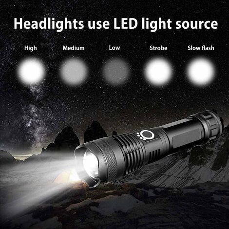 【Service après-vente】En cas de problème avec les lampes de poche rechargeables lors de l'utilisation, n'hésitez pas à nous contacter. Avec leur résistance à l'eau, vous pouvez arrêter de vous soucier des intempéries inattendues, de la pluie ou de la neige. Lampe de camping LED zoomable – Lampe torche portable Il peut être utilisé pour le camping, la randonnée et d'autres situations d'urgence en plein air sous la pluie, la neige ou d'autres zones. Multifonction : le produit comprend : lampe de poche rechargeable, câble USB 【Imperméable et durable】Les lampes de poche rechargeables à haute luminosité sont fabriquées en excellent alliage d'aluminium, résistantes aux chocs jusqu'à 1,5 m. Searchlight Not Charging Lampe De Poche LED - Marque - Modèle - 9 Modes Zoomable - IP65 Lantern Flashlight Nous ferons tous les efforts pour fournir la meilleure solution à nos clients dans les 24 heures. Lampe torche rechargeable et durable : la lampe torche LED cyclable est alimentée par 2 batteries haute capacité pour fournir un cycle de charge, chargeur de batterie CC à 2 emplacements. 【5 modes et zoomable】Les lampes de poche rechargeables ont 5 modes d'éclairage : fort > moyen > faible > stroboscopique > SOS (avec une légère pression sur le bouton d'alimentation pour changer de mode d'éclairage). Lampes de poche LED haute puissance super lumineuses rechargeables 5 modes zoomables pour urgence extérieure maison camping randonnée cadeau Caractéristique...