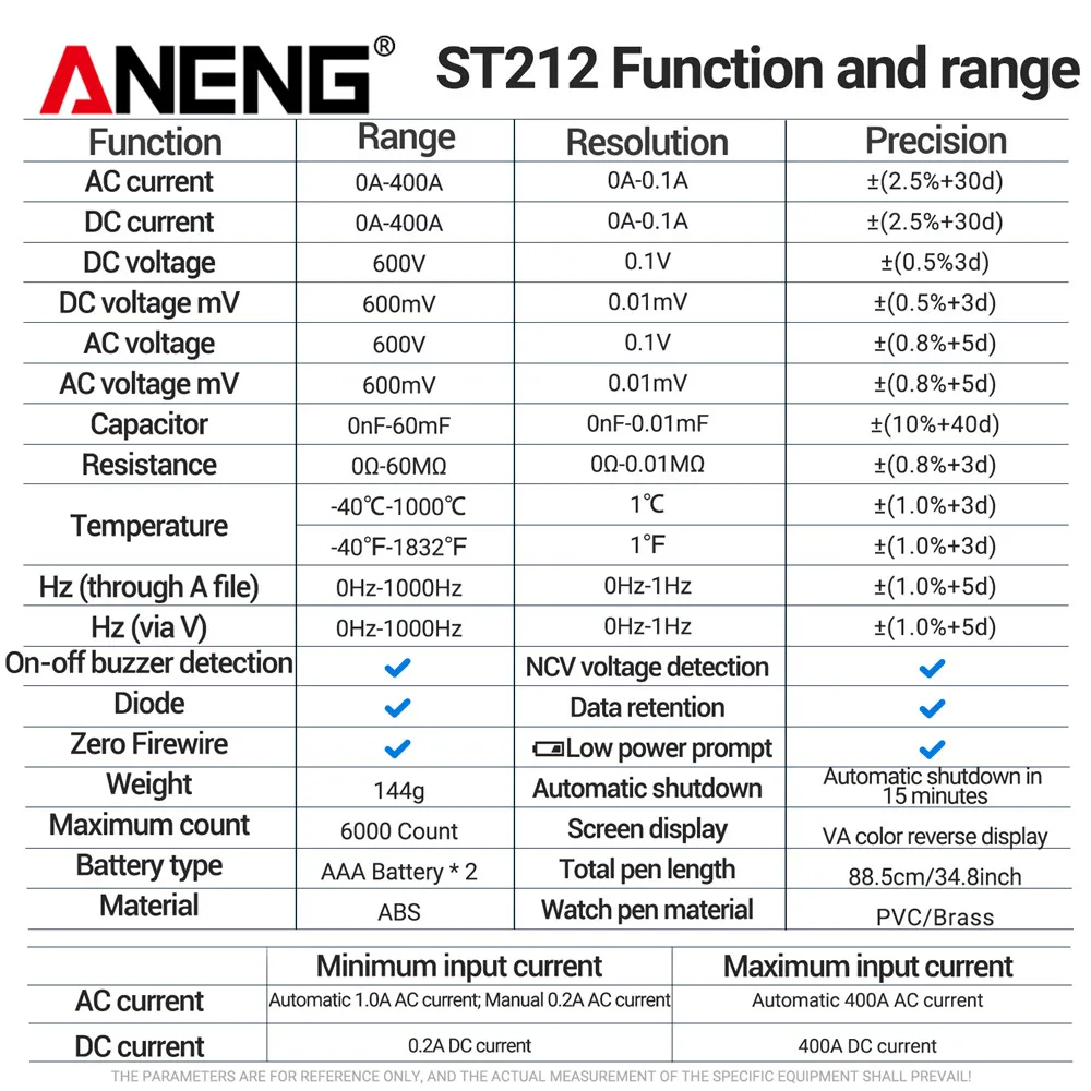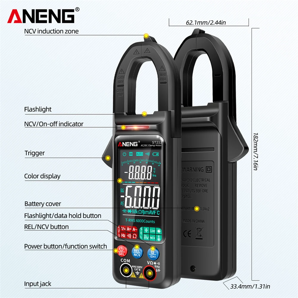 Fonctionnement facile: Ce type de détecteur est conçu avec des fonctions de renonciation automatique et d'auto-off, répondant facilement à vos différents besoins et que le compteur vous rappellera lorsqu'il est à faible quantité d'électricité. Pince multimètre numérique ANENG ST212, 6 000 points, courant The ANENG ST212 DC/AC Current Digital Clamp Meter is a powerful and versatile multimeter designed for both professionals and DIY enthusiasts With a 6000 count display 400A current capacity and a vibrant color screen this meter offers precision and ease of use in electrical testing Let’s dive into its key features benefits and practical... Durable: en plastique, ce multimètre est durable et robuste, vous servant à une utilisation à long terme sans être brisé ou endommagé, vous n'avez pas besoin de le changer fréquemment. Noter:En raison de la différence de lumière et de SN, la couleur de l'élément peut être légèrement différente des images. Portable: conçu avec une petite taille et un poids léger, ce détecteur de pince est facile à stocker et à transporter, vous pouvez le stocker dans la poche ou dans l'étui, il ne prendra pas autant de place. Fréquence: 60Hz-1000Hzinch., CAPACITANCE: 6NF. Multifonctionnel: Ce multimètre peut être utilisé pour tester la tension, le courant, la résistance, la continuité, la fréquence et la capacité, appropriés pour la détection et la maintenance des composants électroniques. Spécification:Matériau: ABS., Couleur: rouge, noir. Veuillez autoriser une légère déviation pour les données de mesure et vous assurer que cela ne vous dérange pas avant de commander. Multifonctionnel: Ce multimètre peut être utilisé pour tester la tension, le courant, la résistance, la continuité, la fréquence et la capacité, appropriés pour la détection et la maintenance des composants électroniques Pince Aneng St212 Lmoikesz ANENG ST212 ST212 ST212 Multimètre DIPLOIRE Auto Ranging Multifonctionnel Ammètre Aneng St212 Notice Fonctionnement facile: ce type de détecteur est conçu avec des fonctions de renonciation automatique et d'auto-off de manière automatique, répondant facilement à vos différents besoins et que le compteur vous rappellera quand il est à faible quantité d'électricité