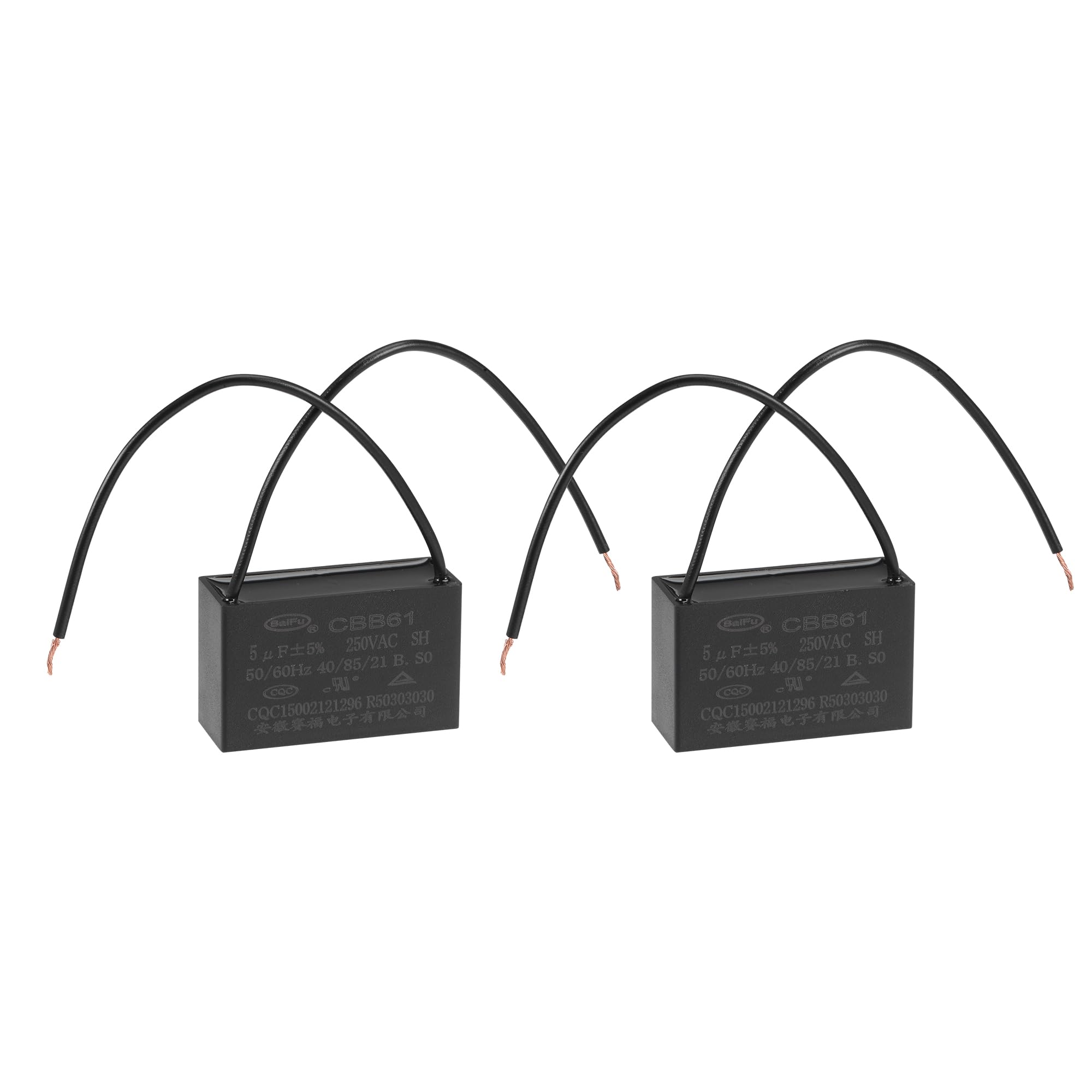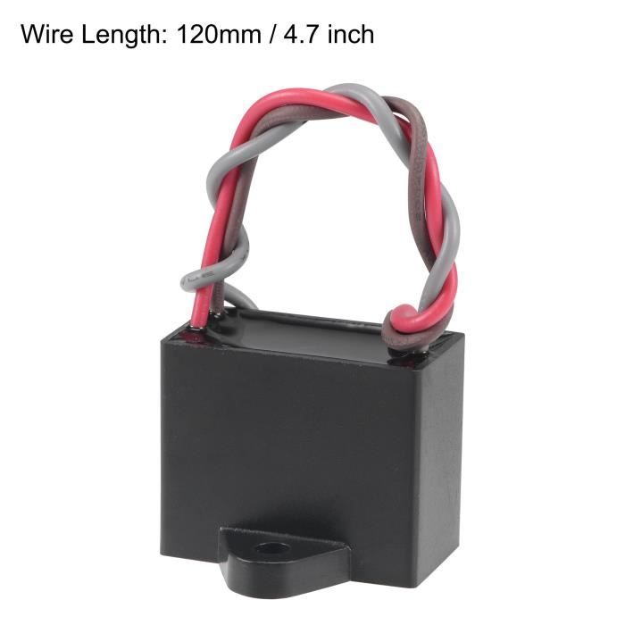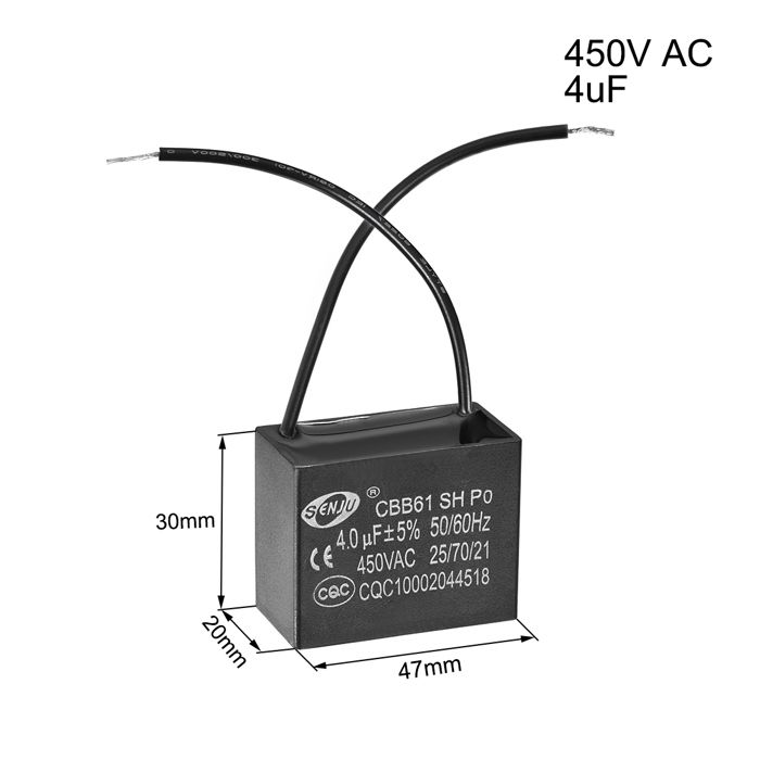 Caractéristiques:Le condensateur de fonctionnement CBB61 a une faible perte, performances électriques parfaites et garantit une longue durée de vie. Fan Capacitor Test Plafond Ventilateur Condensateur CBB61 4.5uF 250V 2 Fils Fan Capacitor Wiring Diagram [Matériel] - Réalisé en feuille de pellicule de polypropylène métallisé avec couvercle en plastique SOURCING MAP Condensateur ventilateur plafond CBB61 3,5-4-2,5uF 250V AC 4 Fils Condensateur à... [Environnement de travail] - Le condensateur CBB61 est mis en ouvre au démarrage et au fonctionnement d'un moteur monophasé avec un système d'alimentation électrique CA 50 Hz/60 Hz sourcing map Plafond Ventilateur Condensateur CBB61 25uF 250V AC 2 Fils Métallisé Polypropylène Film Condensateur 48x38x26mm pour Électrique sourcing map Lot de 5 condensateurs de ventilateur de plafond CBB61 1,5 uF 450 V [Spécifications] -Capacité nominale: 5uF; Tolérance: ±5%; Tension nominale: 250V AC; Dimension du couvercle: 47 x 29 x 18mm/1,9 x 1,1 x 0,7pouces; Fréquence nominale: 50/60 Hz; Catégorie climatique: 40/85/21 Ce condensateur est amplement employé aux ventilateurs de plafond, ventilateurs à paroi, ventilateurs sur pieds, les ventilateurs industriels, ventilateur de hotte cuisinières, ventilateur d'échangeur d'air, pompe à eau, moteur, générateur, etcRemarque:Ce condensateur n'a pas de pôles positif et négatif, il peut être câblé à volonté.