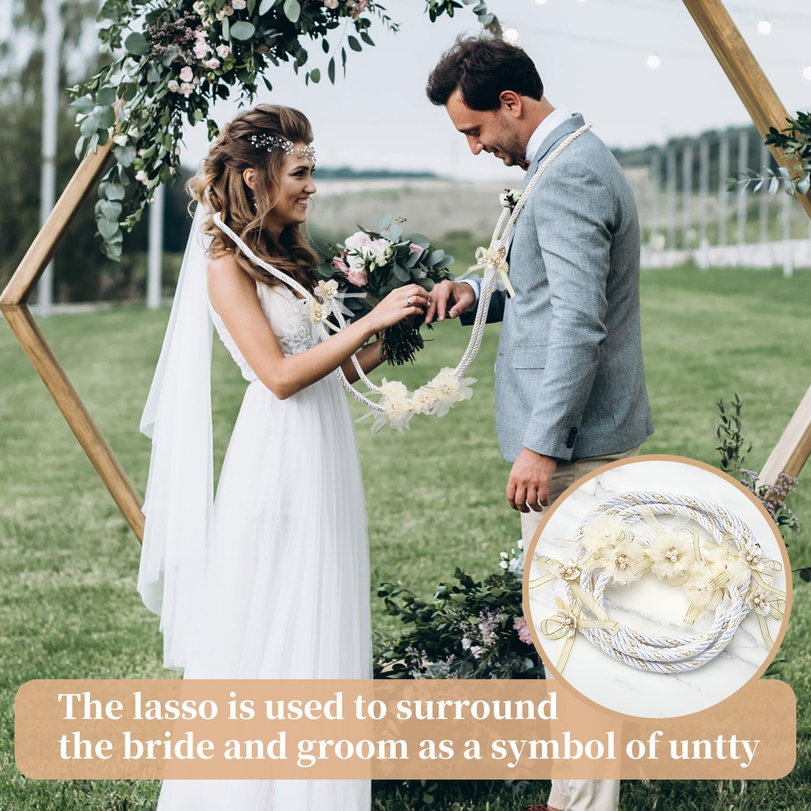 PH PandaHall Corde lasso de mariage Les cordes de mariage romantiques en or et blanc entrelacées avec la palette de couleurs, avec des fleurs, des rubans, etc., respire une sensation romantique et élégante, impliquant que les deux personnes à partir de maintenant à la main ne se quittent jamais Corde lasso de mariage traditionnelle pour mariage - Corde en or blanc avec fleur Lazo Para Boda pour cérémonie de mariage - Cadeau de mariage - Taille : 166,9 cm - Design : rose, nœuds, or et blanc - Pour cérémonie de mariage, décoration de chambre. Dans le cadre de la cérémonie de mariage, le lasso est utilisé pour encercler la mariée et le marié, symbolisant l'unité. Lazo De Cordón Vintage Para Boda | Meses sin interés Norbi 126 Inch Wedding Lasso Rope Lazo Para Boda Wedding Cord Ceremony Rose Flower Lasso For Wedding Lazo Cord Traditional Wedding Unity Cord For Ceremony Lazo De Boda Mexico Bridal Gift, 1Pcs Chaque fois que vous regardez les photos, vous vous rappellerez le moment symbolique où le lasso a été attaché, vous vous tenez la main et marchez joyeusement dans le mariage. La corde lasso de mariage est également idéale comme cadeau de mariage pour vos proches et amis, en leur donnant une cravate souvenir pour leurs doux moments. Souvenir inoubliable : le cordon de mariage peut être utilisé comme un « souvenir tangible » de votre jour de mariage, chérissant les beaux souvenirs et les promesses que vous avez faites les uns aux autres. Ce lasso peut être utilisé efficacement pour différents arrangements de mariage et décorations culturelles et traditionnelles. Les cordes lasso de mariage avec nœuds dégagent l'élégance et rappellent doucement que les amoureux ne se sépareront jamais et travailleront ensemble à l'avenir. Photo libre de droit de Cowboys Avec Corde Lasso Cheval Et Lasso De... Taille juste : la corde de mariage mesure environ 166,9 cm.