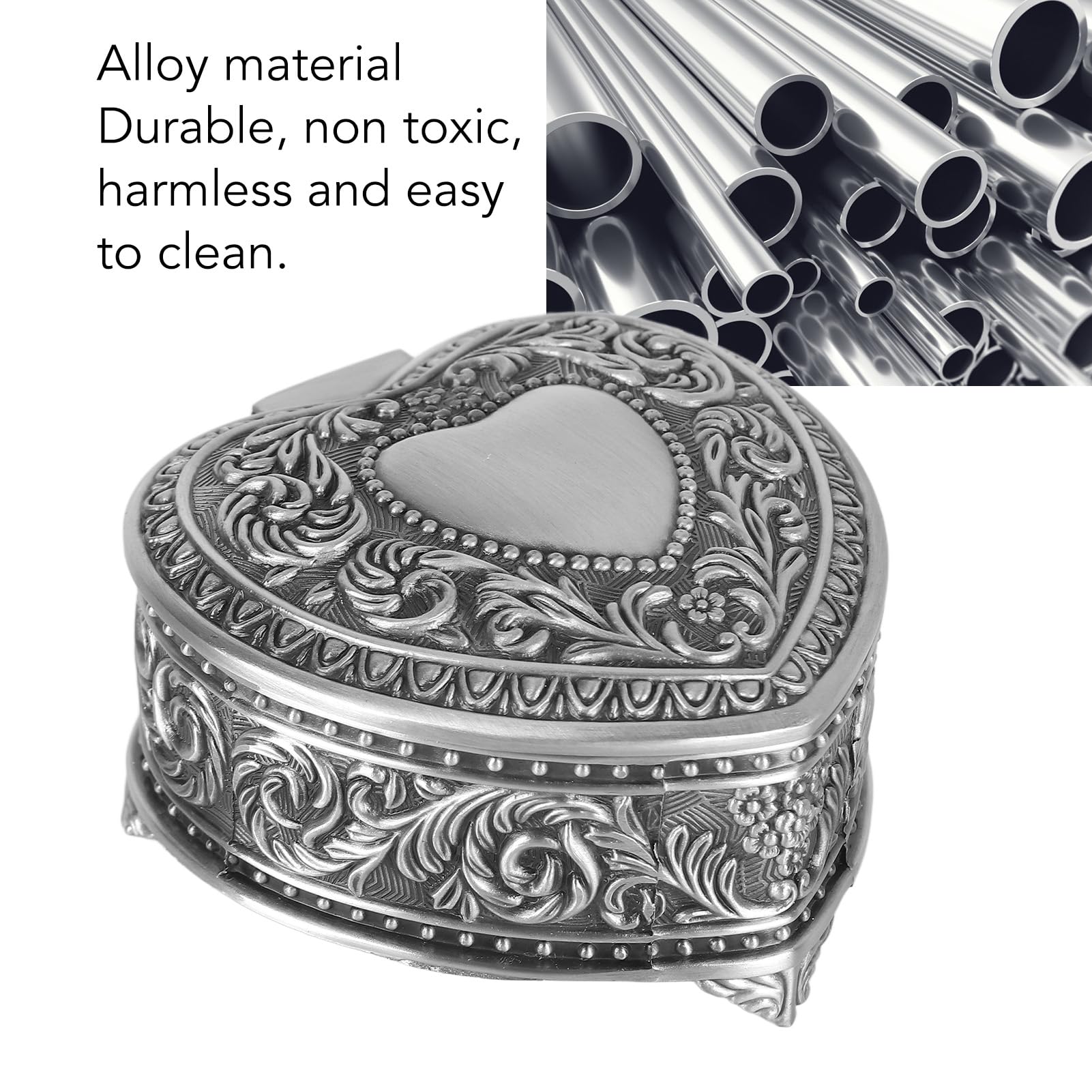 Petite Boîte à Bijoux En Forme De Coeur En Métal Argenté Vintage 8 x 8 x 4,5 cm / 3,1 x 3,1 x 1,8 pouces, peut être facilement transporté lorsque vous voyagez., 5., [Cadeau délicat] : la boîte à bijoux vintage en forme de cœur est d'excellents cadeaux pour les anniversaires, la fête des mères, la Saint-Valentin, Noël pour les familles et les amis. [Design distinctif en forme de cœur] : l'attrait vintage de cette boîte à bijoux réside dans sa forme de cœur unique – un choix de design à la fois innovant et attrayant. Boîte à Bijoux en Cuir de Poche en Cœur – Bijoux Coquillages Belle et pratique : cette boîte à bijoux vintage en forme de cœur est fabriquée en alliage de zinc de haute qualité, peut garder son éclat pendant une longue période. Placez les boîtes au trésor dans votre maison pour améliorer votre goût général, élégant et haut de gamme. Servant à la fois des fonctions de rangement et de décoration [Légère et pratique] : Ne pesant presque rien et mesurant seulement 8 x 8 x 4,5 cm / 3,1 x 3,1 x 1,8 pouces, cette boîte à bijoux en alliage en forme de cœur est le compagnon de voyage idéal. C'est une belle façon de montrer à vos proches que vous tenez à eux. Glissez-le dans votre valise ou votre sac à main et gardez vos bijoux en sécurité lors de vos déplacements. Il garantit que vos bijoux restent sans rayures et sans poussière, les gardant aussi charmants que lorsque vous les avez reçus pour la première fois. [Artisanat en alliage] : avec sa composition en alliage de haute qualité, cette boîte à bijoux en forme de cœur offre robustesse et longévité. Dimensions : L 10 cm x H 10 cm x P 5 cm Extérieur : 100% cuir vachette grainé, frappé du logo PÖ&ME doré Fermeture : Zip doré élégant et sécurisé Intérieur : Compartiments pour organiser bagues, boucles d’oreilles et petits accessoires Miroir intégré pour un ajustement parfait à tout moment Revêtement en velours doux pour protéger vos précieux bijoux Un écrin délicat, pensé pour conserver et sublimer vos joyaux avec élégance. 8 x 8 x 4,5 cm / 3,1 x 3,1 x 1,8 pouces Liste des paquets : 1 x boîte à bijoux coeur vintage