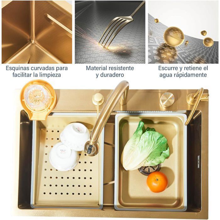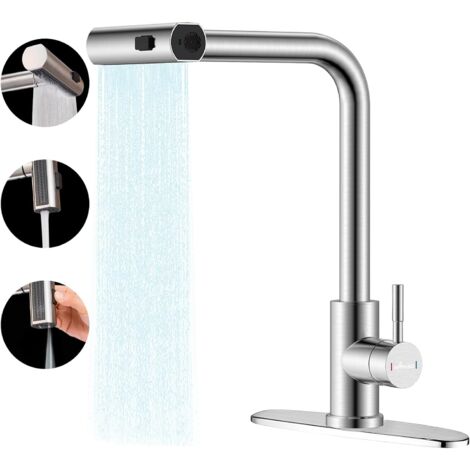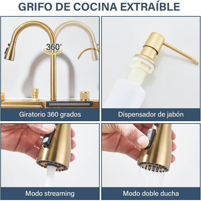 Garantit votre santé : robinet de cuisine extractible en acier inoxydable 304 de haute qualité, anti-corrosion et antirouille, durable, la valve améliorée a été testée pendant des dizaines de milliers de cycles pour garantir une ouverture et une fermeture serrées et pour éviter les fuites, et elle promet des ingrédients sans plomb, ce qui en fait un choix fiable pour construire une cuisine saine et une cuisine durable. 4 modes de jet : Ce robinet de cuisine cascade propose quatre modes de jet différents : cascade, douche, jet d'eau et anti-éclaboussures. Il suffit de tourner... Robinet purifié à 3 voies avec robinet d'eau extractible pour lavabo de cuisine Le robinet de cuisine en laiton à poignée unique facilite le réglage de l'eau chaude et froide. Robinets De Cuisine Avec Pulvérisateur Extractible, Robinets Fabriqué en acier inoxydable SUS 304 noir bronze de qualité supérieure et doté d'une finition nanotechnologique PVD multicouche, ce robinet à poignée monotrou tactile garantit une résistance à la corrosion et à la rouille Nouvelles caractéristiques et version : le robinet de cuisine Waterfall de FROPO dispose de quatre modes de pulvérisation améliorés : cascade pour le nettoyage délicat des ingrédients, jet pour remplir les récipients, le spray peut nettoyer les taches sur les fruits et balayer pour un lavage efficace de la vaisselle. Gagnez du temps : le robinet de cuisine doré à débit d'eau plus large et puissant avec pulvérisateur rétractable vous permet d'économiser plus de temps de nettoyage, la longueur extractible de 40,6 cm élargit la gamme d'utilisation pour le nettoyage quotidien, adapté à la plupart des éviers à double évier.