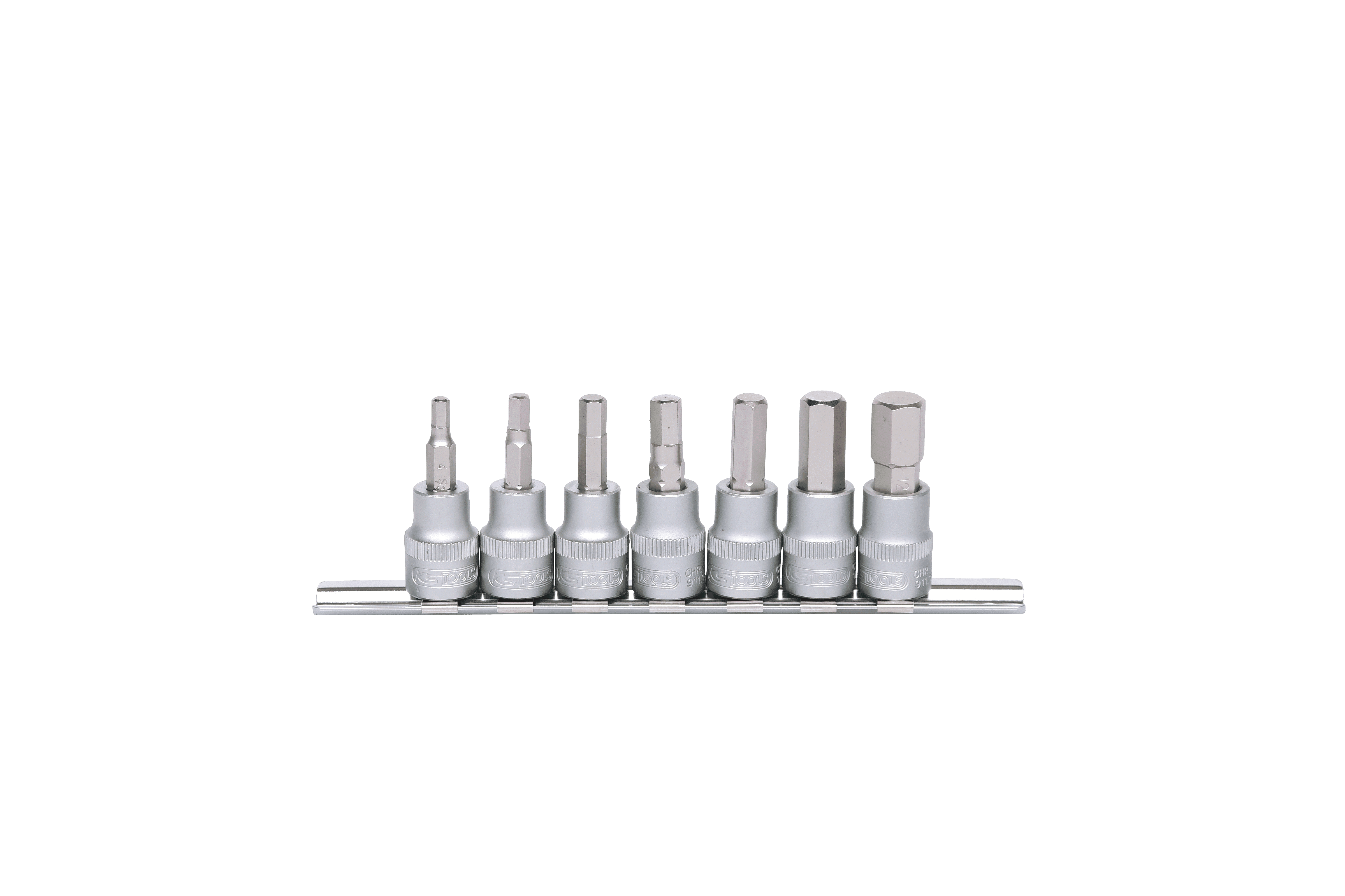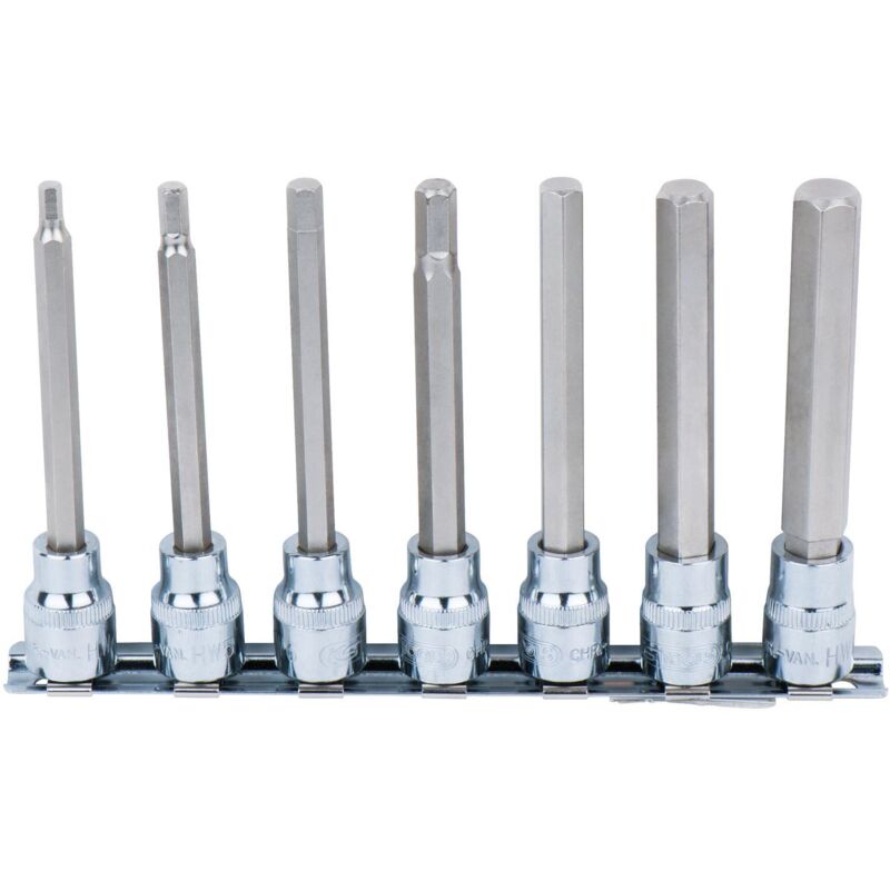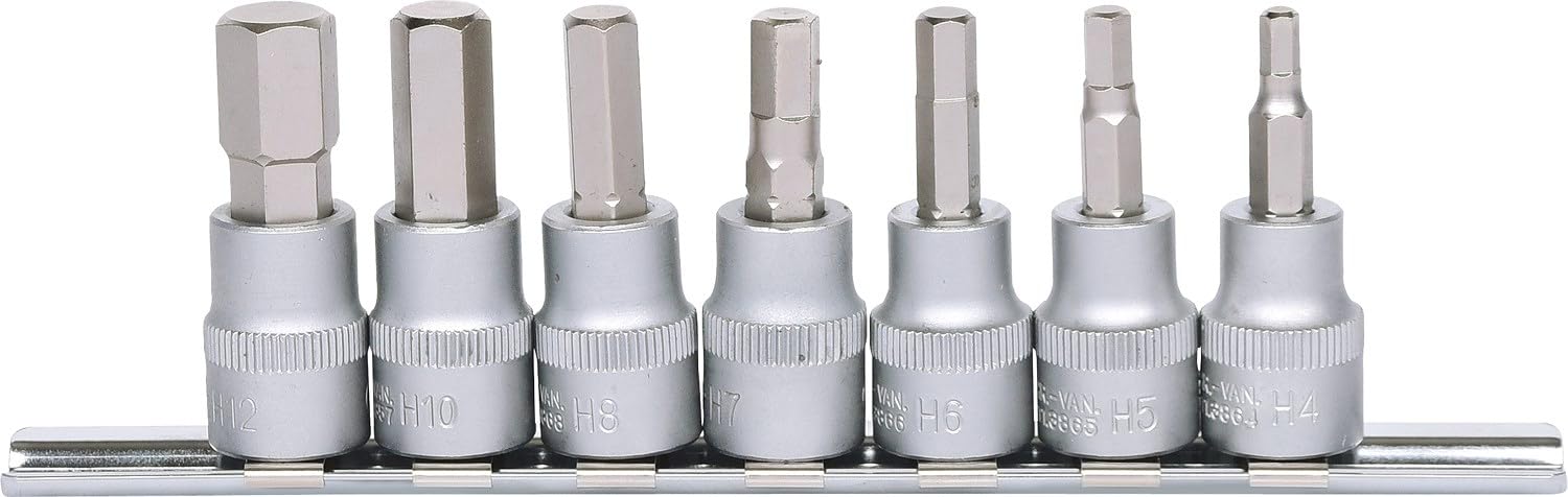Conforme à la norme DIN 7422., Entraînement carré interne DIN 3120/ISO 1174 avec réception à bille , Bouton pression ajusté. Pour une utilisation manuelle , Finition mate., Chrome vanadium. Pièces dans le set : 7 pcs., Moleté , Six pans intérieur 6 pans intérieur. Selon DIN 7422. Carré d'entraînement intérieur selon DIN 3120 / ISO 1174 avec encoche pour verrouillage par bille. Avec embout serti Fabricant: KS Tools · Poids: 310g · Longueur: 50 mm · Porte-outil: 3/8'' · Type d'entraînement: hexagonal · Taille d'entraînement de la tête de vis en mm : 10 mm, 12... Tournevis 6 Pans KS TOOLS 911.3945 Douilles 3/8 Rail CHROMEmat 7 Pcs Douille Btr 911.3945 KS TOOLS Steckschlüsselsatz Innensechskant, Chrom-Vanadium