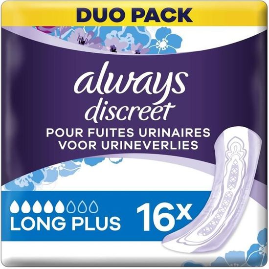 Bien qu’elles soient jusqu'à 40 % plus fines que les produits concurrents de la marque*, Ces serviettes absorbent 2X plus que nécessaire. Unique avec deux compartiment de protection. - Essayez également nos autres serviettes d’incontinence pour les fuites urinaires fréquentes d’intensité moyenne, lorsque autres les serviettes d’absorption ne suffisent pas. Instructions Serviettes+ Pour Fuites Urinaires Et Incontinence Long Always Discreet Avec le rap iddry et odou interlock de protection Unique avec deux compartiment de protection. Always Discreet pour fuites urinaires Incontinence long plus urinaires, Avantage Pack, 1er Pack (1 x 16 pièces) : : Hygiène et SantéÀ propos de cet article Le noyau unique à double verrouillage aide à bloquer les odeurs et l'humidité La technologie exclusive anti-odeurs neutralise les odeurs instantanément et en continu Fin et flexible même mouillé, s'adapte... ** *Le pourcentage varier selon la personne **Basé sur un besoin moyen d’absorption. Culottes femme pour fuites urinaires | Always Discreet Aide à inclure les odeurs et l'humidité Avec le rap iddry et odou interlock de protection Fin et flexible, même lorsqu'ils sont mouillés., Ajustement discret , Emballé individuellement.