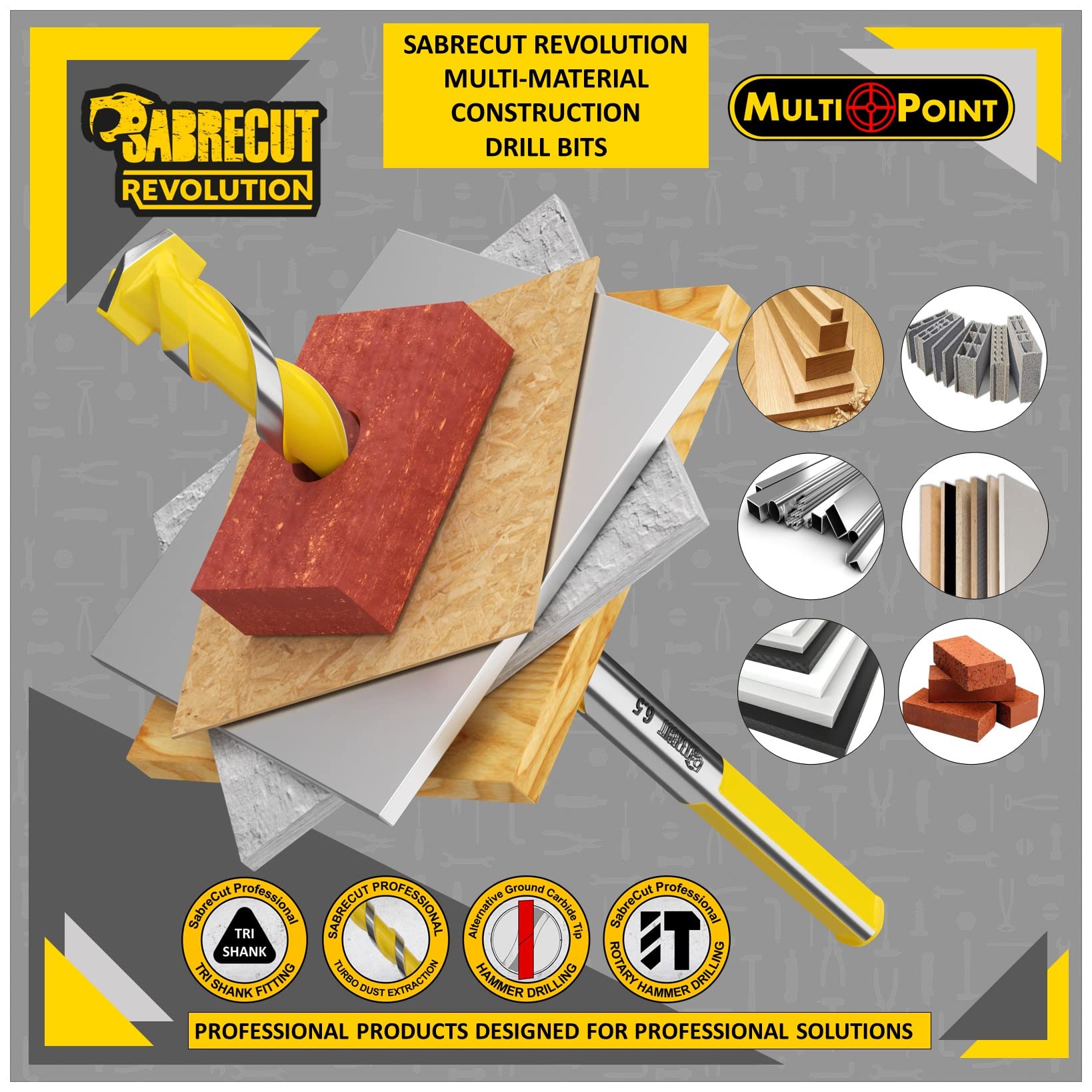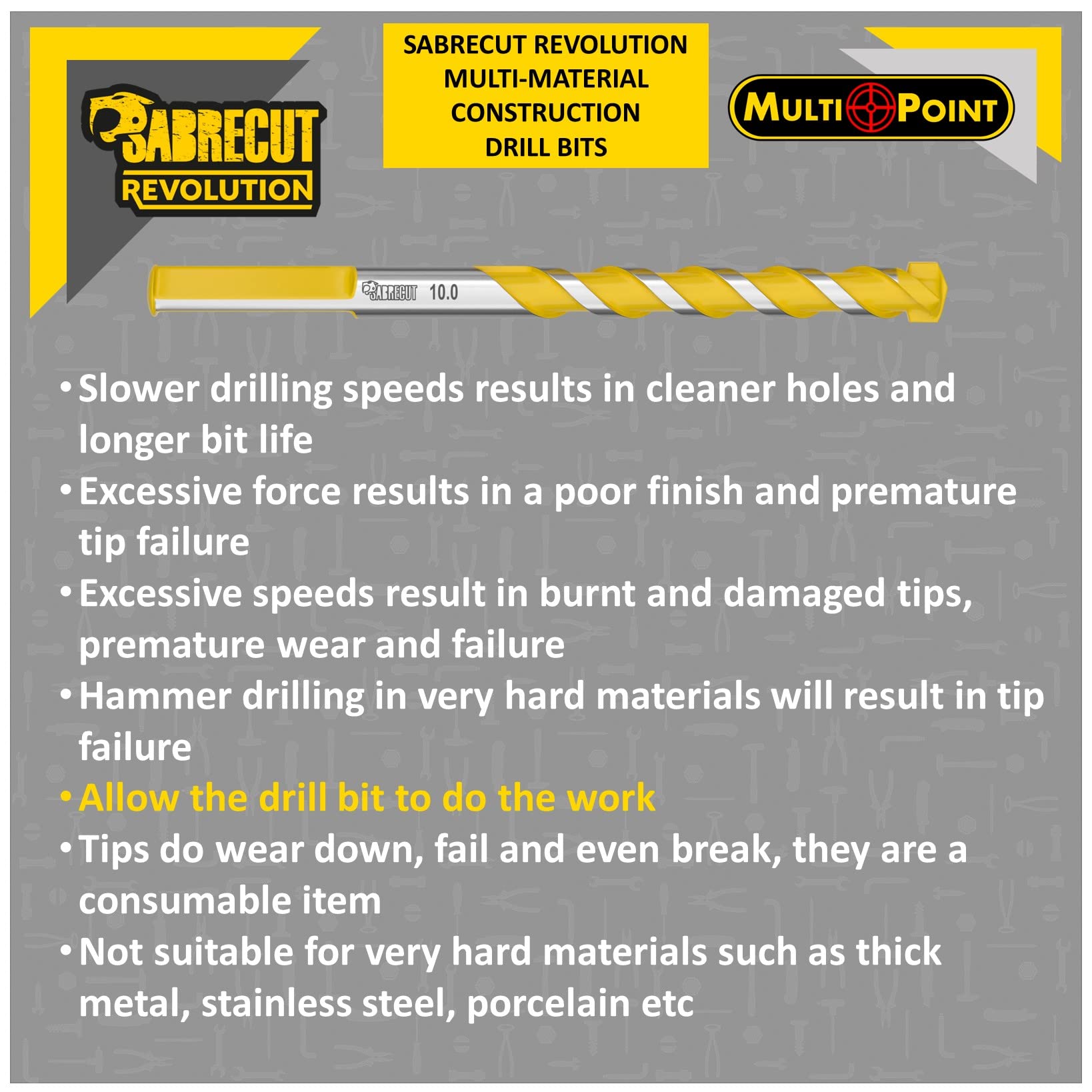 Contenu:- 1 pièce d'embout de 4mm x 75mm (flûte de 30mm) SCRMCT040- 1 pièce d'embout de 5mm x 85mm (flûte de 40mm) SCRMCT050- 2 pièces d'embouts de 5,5mm x 85mm (flûte de 40mm) SCRMCT055br- 1 embout de 6mm x 100mm (flûte de 55mm) SCRMCT060- 2 embouts de 6,5mm x 100mm (flûte de 55mm) SCRMCT065- 1 embout de 7mm x 100mm (flûte de 55mm) SCRMCT070- 1 Pièce 8mm x 120mm (flûte 70mm) Embout SCRMCT080- 1 pièce 10mm x 120mm (Flûte 70mm) Embout SCRMCT100Forets SabreCut Tri Shank Multi Construction ultra durables longue duréeCes forets multi-matériaux en carbure multipoints sont conçus pour s'attaquer à une gamme de matériaux, notamment la brique, le bloc, le béton, le carrelage, le bois, l'aluminium et le métal à paroi mince., feuilles et profils. Ces forets à trois tiges à usage général sont compatibles avec les perceuses à percussion, les perceuses-visseuses et les visseuses à percussion , SCRMCT001 BOSCH SDS Plus-1 Drill Bit 5.5MM 6MM 6.5MM 7MM 8MM 10MM 12MM 14MM 16MM 18mm 20mm 22mm 2608680260 2608680292 I2800102406 Alargador Aço Cirúrgico PRETO e PRATA 1mm/2mm/3mm/4mm/5mm/6mm/7mm/8mm... Conçus pour s'attaquer à une variété de matériaux, notamment la brique, les blocs, le béton, le carrelage, le bois, l'aluminium, le plastique, les tôles et profilés à parois minces 10 X SabreCut SCRMCT001 4 Mm 5 Mm 5,5 Mm 6 Mm 6,5 Mm French Équipés d'une tige tri-queue, ces forets à usage général sont compatibles avec les perceuses à percussion et les perceuses., conducteurs. Perce jusqu'à 2 fois plus vite que les forets à maçonnerie normaux et possède une flûte plus large conçue pour un retrait plus rapide des débris Compatible avec :Toute machine acceptant un Tri ShankNon conçu pour le béton arméNon recommandé pour les carreaux de porcelaine ou les tôles plus épaisses Achetez 10 x SabreCut SCRMCH001 4mm 5mm 5,5mm 6mm 6,5mm 7mm 8mm 10mm Tige hexagonale Ultra Durable Longue durée de vie Marteau perforateur à pointe en...