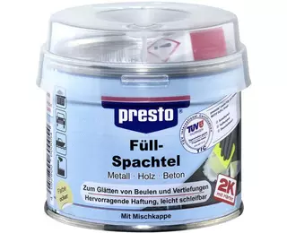 Mais il y a d'innombrables possibilités d'utilisation pour la réparation et la préservation de la valeur non seulement sur le véhicule, mais aussi dans la maison et le jardin. Résistant aux acides faibles, aux alcalis faibles; propulseurs, aux solvants, à l'eau et aux sels., Fabricant : Presto. Composé de résine polyester insaturée hautement réactive remplie d'une nouvelle combinaison de pigments microfins. Mastique Carrosserie Voiture Presto Mastic De Finition Blanc | 0.3 Kg Acheter Chez Fibre De Verre Carrosserie Kit réparation mastic résine polyester fibre de verre fer métal 250gr PRESTO Le mastic de rebouchage fini polyester en formant 1Kg assure recouvrir les trous présent sur les murs ou les rayures profondes sur la carrosserie des... Modèles compatibles : aucune information ou universelle. Caractéristiques Type produit Mastic polyester Contenance 250 g Conditionnement 1 produit (s) PRESTO - Mastic polyester fin avec tube durcisseur - pot de 250g - 12043 Les plus: Argumentaire: Livres avec: Epaisseur: contenance: 250 g Couleur: RAL: Applications: Aspect: GRAIN: Longueur: Largeur: Largeur mm: DIM LARG: 0 DIM LONG: 0 Dimensions... Contenu de l'emballage : 2 pièces de 250 g comme sur l'image du produit. Très bonne adhérence. Mastic carrosserie, résine carrosserie | NORAUTO