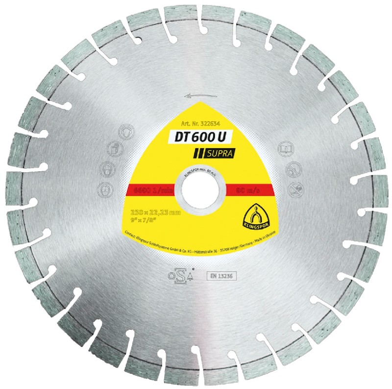 Les produits Klingspor Diamond conviennent à différents matériaux et peuvent être utilisés sur des machines à main, des scies de table, des coupe-joints électriques jusqu'à 20 kW. Diamètre du disque : 115 mm , Qualité : SUPRA , 22,23 mm Disque DT 600 F Supra 325368 - Les Matériaux De La Cité Klingspor 325368 DT 600 F Supra Disque à Tronçonner Diamanté La réduction de l'impact environnemental, les prix du marché et le support individuel des fournisseurs font de Klingspor l'une des entreprises les plus performantes sur le marché des abrasifs. Klingspor 322769 SMT 624 Supra Disque segmenté Diamètre 115 mm de perçage 22.23 mm INOX, acier... Grâce à son équipe hautement professionnelle et à sa concentration constante sur la recherche et le développement, Klingspor fournit depuis plus de 125 ans des abrasifs haute performance sur support ainsi que des disques à tronçonner et à poncer pour les industries les plus importantes du marché mondial. Ce qui compte, c'est le résultat commun! Avec plus de 50 000 produits, vous trouverez la solution de ponçage la plus efficace pour chaque matériau. Disque à tronçonner pour le tronçonnage de l'acier inoxydable 655252500000