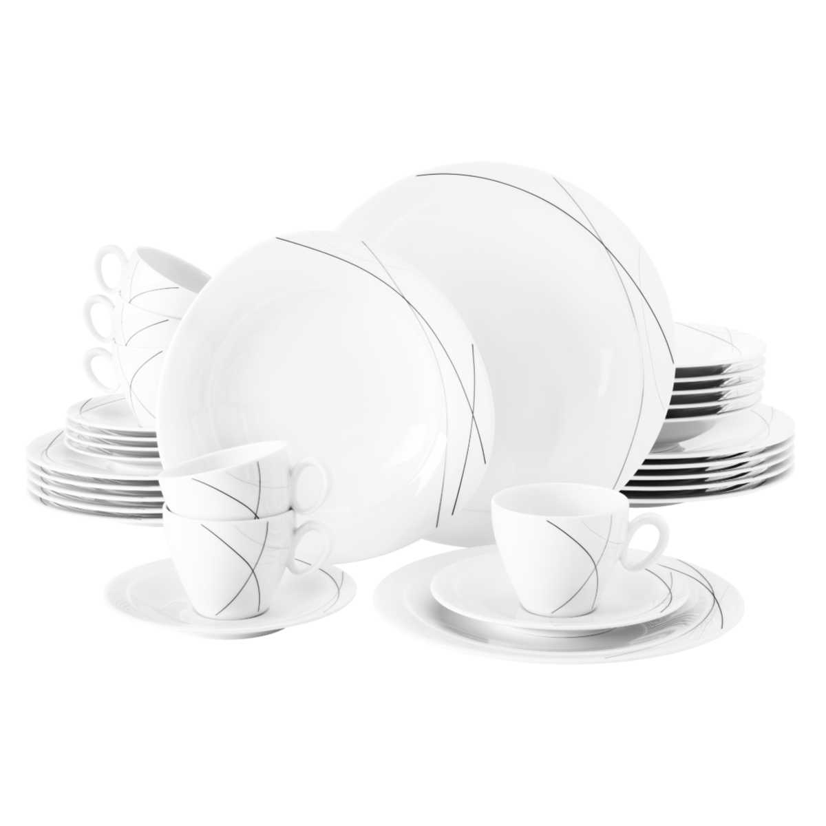 Contenu de la livraison : 6 assiettes plates, 6 assiettes creuses, 6 assiettes à petit-déjeuner, 6 tasses à café, 6 grandes soucoupes combinées, 6 gobelets avec anse Tous les articles passent au lave-vaisselle, au micro-ondes et au four. Le Service de table Beat 30 pièces de Seltmann Weiden est fabriqué en porcelaine de haute qualité et comprend 6 tasses à café, 6 sous-tasses, 6 assiettes à dessert, 6 assiettes creuses et 6 assiettes plates. Ce large service convient aussi bien pour inviter des amis et la famille à une tasse de café que pour servir un repas savoureux Bavaria Valeur SELTMANN WEIDEN Service De Table 12 Pièces BT - Beat - Forme : Rond Avec Relief Rainuré - Style Moderne - Blanc : Seltmann Weiden Bavaria Vintage Service à café No Limits 18 pièces de Seltmann Weiden Le parfait départ dans la série Beat, avec les articles les plus importants de cette série., !