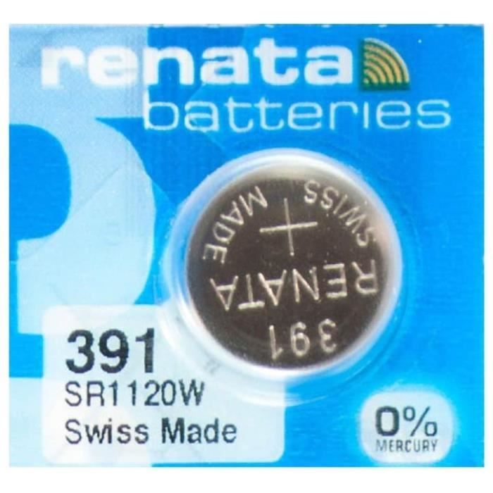 Pile bouton Renata 391 / SR1120W 0% mercureDonnées techniquesCapacité50 mAh Tension1., 55 V Poids0., 87 gDimensionsDiamètre11., 6 mm Hauteur2., 1 mmCross Reference GuideRenata391 (OEM) SR1120W SR1120W SR1120W SR1120W 391 V391391 D 381/391 L 280-30 SB-BS/ES Fiche produit relative aux qualités et caractéristiques environnementalesInformations fournies conformément à l’article 13., 1 de la Loi française n° 2020-105 du 10 février 2020 relative à la lutte contre le gaspillage et à l'économie circulaire (Loi AGEC) :Des composants internes inaccessibles des piles à l`oxyde d`argent, série 391 (OEM) contiennent plus de 1mg d`argent. Pile 394 Montre Swatch Lot De 3 Piles Bouton Silver Oxyde 339 / SR614 SW 0% Mercure Pile Sr936sw Notre large portefeuille comprend plus de 40 différents types de piles boutons. Pile bouton Silver Oxyde 391 / SR1120W 0% mercure x 3 RENATA. Vendu par Stock Bureau Maison Bien... SR1120SW AG8 Pile Montre Renata 391 - Fabriqué Suisse - 1.5V Sans Mercure Pile 394 Montre RENATA Pile bouton Silver Oxyde 319 / SR527 SW 0% Mercure 1,55V - Pile bouton Renata 319 / SR527 SW 0% mercureDonnées techniquesCapacité21 mAh Tension1.55 V Poids0.29 Pile bouton Renata 391 / SR1120W 0% mercureDonnées techniquesCapacité50 mAh Tension1.55 V Poids0.87 gDimensionsDiamètre11.6 mm Hauteur2.1 mmCross Reference GuideRenata391 (OEM)SR1120WSR1120WSR1120WSR1120W391V391391D 381/391L280-30SB-BS/ESFiche produit relative aux qualités et caractéristiques environnementalesInformations fournies... Pile bouton Renata 391 / SR1120W 0% mercure , Données techniques , Capacité , 50 mAh Tension , 1., 55 V Poids 0., 87 g Dimensions Diamètre 11., 6 mm Hauteur 2., 1 mm Cross Reference Guide Renata 391 (OEM) SR1120W SR1120W SR1120W SR1120W 391 V391 391 D 381/391 L 280-30 SB-BS/ES Fiche produit relative aux qualités et caractéristiques environnementales Informations fournies conformément à l’article 13., 1 de la Loi française n° 2020-105 du 10 février 2020 relative à la lutte contre le gaspillage et à l'économie circulaire (Loi AGEC) : Des composants internes inaccessibles ., ., . Ce produit est majoritairement recyclableNous avons la solution adaptée pour chaque appareil électronique nécessitant une source d'énergie compacte et durable basse tension.
