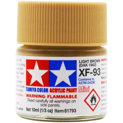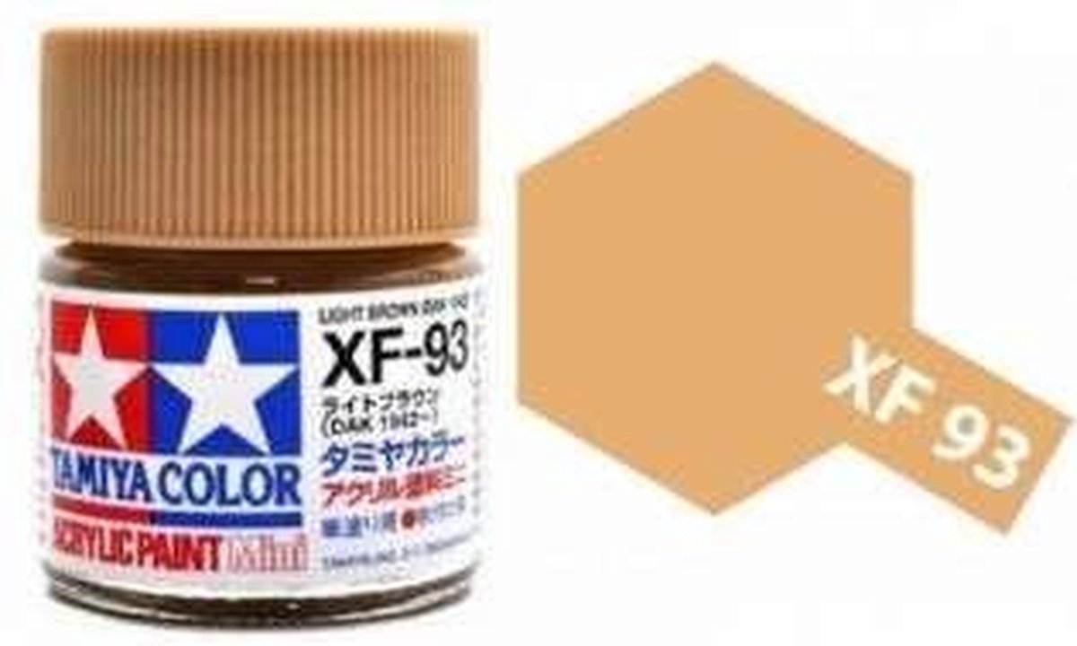 Les peintures acryliques Tamiya sont fabriquées à partir de résines acryliques solubles dans l'eau et sont excellentes pour la peinture au pinceau ou l'aérographe. Cette peinture recrée la couleur brun clair utilisée à partir de 1942 par l'allemand Afrika-Korps (DAK)., Contenu : 10 ml Peinture maquette acrylique Tamiya serie XF Tamiya TAMXF : Miniatures et maquettes haut de gamme Peinture acrylique marron clair DAK 1942 – Pot 10 ml – Tamiya XF-93 Recréez fidèlement les teintes historiques des véhicules militaires allemands avec la peinture acrylique XF-93 Brun Clair DAK 1942 de Tamiya. Cette couleur reproduit la teinte spécifique utilisée par l’Afrika Korps (Deutsches Afrikakorps) à partir de 1942, parfaite pour peindre blindés, camions et autres... Pour de meilleurs résultats de brossage, utilisez le retardateur de peinture Tamiya (87114) pour une finition plus lisse sans coup de pinceau. Paint Color List Tamiya 81793 - Peinture Acrylique Maquette Mini XF-93 Brun Clair Peinture Tamiya Marron Ces peintures peuvent être utilisées sur les résines de styrène, le polystyrène, le bois, ainsi que tous les modèles de plastiques courants. L'utilisation de Tamiya Lacquer Thinner donnera des résultats de séchage plus rapides et une finition plus dure. La peinture couvre bien, coule en douceur et peut être mélangée facilement. TAMIYA XF-93 DAK 1942 TAM81793 Peinture acrylique pour plastique Marron clair : : Jeux et JouetsPolitique de retour Retours & garanties légalesDemandez le retour d’un produit jusqu’à 14 jours après sa réception, sans motif, pour obtenir un remboursement complet (prix et frais de livraison) au titre du droit légal de rétractation. permet en plus les retours jusqu...