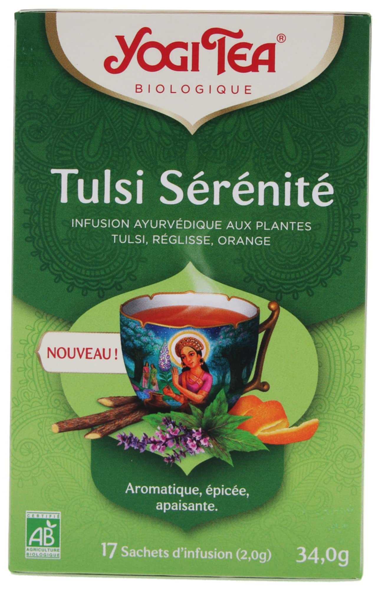 *certifié biologique Mode d'emploi 1., Placez un sachet de thé dans une tasse., 2., Versez de l'eau chaude dans la tasse., 3., Laisser infuser le thé pendant 5 à 7 minutes., 4., Retirez le sachet de thé et dégustez le thé. Yogi Tea Serenidad Tulsi 17 filtros - Comprar Infusión Ayurvédica Le Tulsi peut avoir des effets secondaires. L'infusion bio Tulsi Sérénité Yogi Tea est une préparation ayurvédique à base de tulsi, de réglisse et d'orange. Quelle est la composition de l''infusion bio Tulsi Sérénité Yogi Tea ? Tulsi*, basilic*, réglisse*, gingembre*, citronnelle*, zeste d’orange*, cannelle*, zeste de citron*, huile essentielle d’orange*, citron vert*, poivre noir*, cardamome*, clous de girofle*, estragon**certifié biologique YOGI TEA® Tulsi Sérénité est l'infusion parfaite pour toutes celles et ceux qui souhaitent cultiver la sérénité au quotidien. Avertissement De Sûreté Contient de la caféine Non recommandé pour les enfants ou les femmes enceintes. Avec le précieux tulsi également connu en ayurveda sous le nom de « reine des plantes » ou « basilic sacré » associé aux notes fruitées d'orange et à la... Sachets pratiques : Idéal pour une infusion rapide et savoureuse où que vous soyez. L'invitation à un rituel quotidien réconfortant Transformez votre pause thé en un véritable rituel de détente avec le Yogi Tea Tulsi Sérénité bio. Offrez-vous un moment hors du temps, où chaque gorgée vous rapproche d'un équilibre intérieur Yogi Tea Tulsi Serenity Organic 17 sachets , THÉ , Thé Yogi Tulsi Sérénité YOGI TEA Infusion Bio X17 Sachets - Parapharmacie Prado Mermoz Coffret Infusion Bio