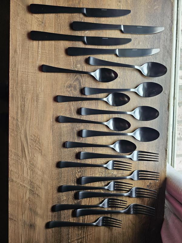 Produit couvert par une garantie à vie limitée et passe au lave-vaisselle Ensemble de couverts Sola Nordica Satin - Acier inoxydable 18/10 - 70... Comprend 4 couverts de table de 5 pièces , (4) Couteaux de table , 4 fourchettes de table Acier inoxydable 18/0 de haute qualité pour plus de durabilité et de résistance à la rouille Couvert Noir Mat Ensemble De Couverts Sola Nordica Satin - Acier Inoxydable 18/10 - 70 Couverts Noirs Mat So, obviously, there's the stain black finish which is a stylish deviation from the traditional. Because of the 18/0, these *may* chip and show signs of wear faster than you can see it on a silver finish Long et mince, Dean frappe une note contemporaine avec des lignes inspirées de l'architecture moderne. Les consommateurs apprécieront la polyvalence et la personnalité unique de chaque finition - l'une est sûre de correspondre à la leur!