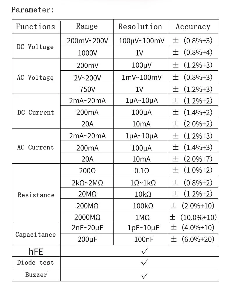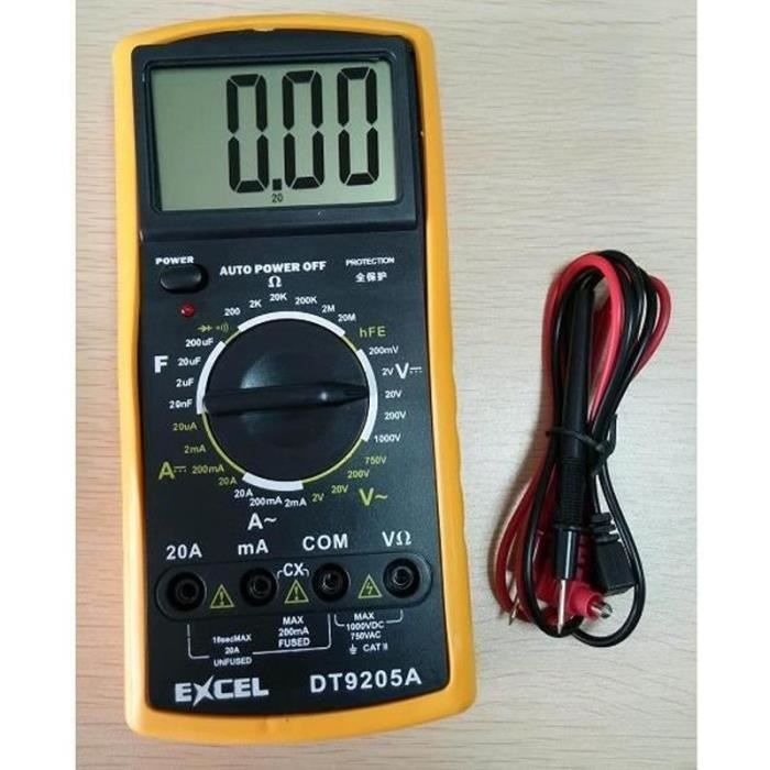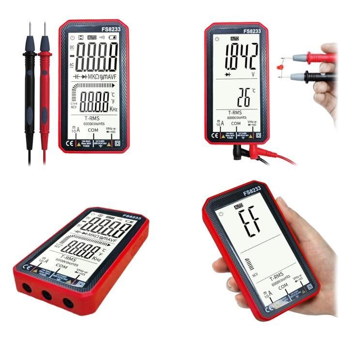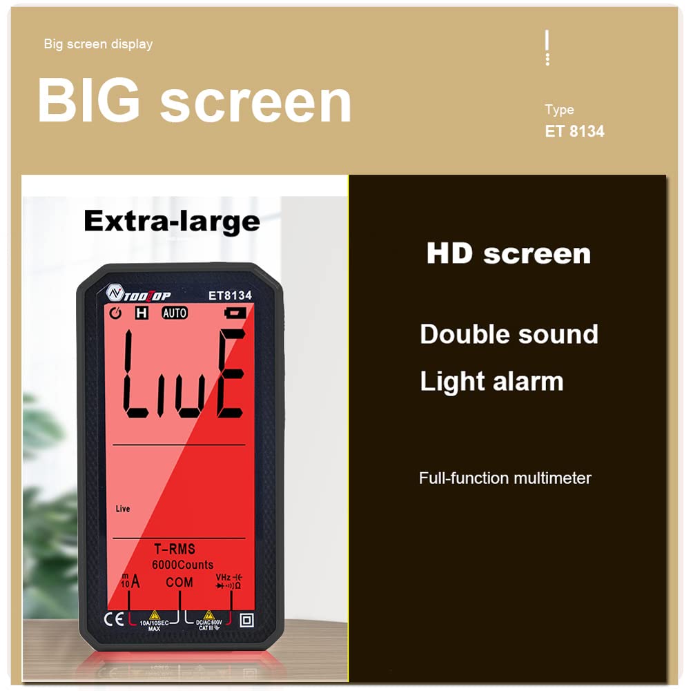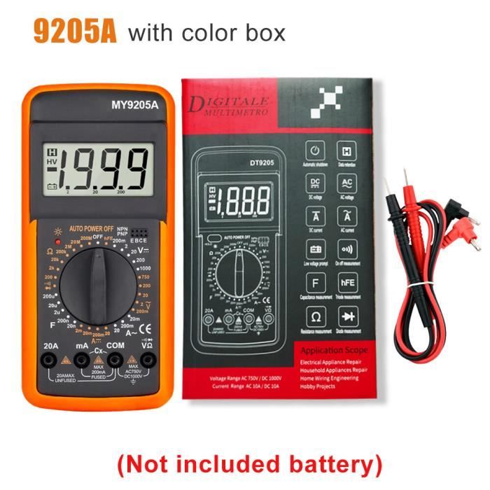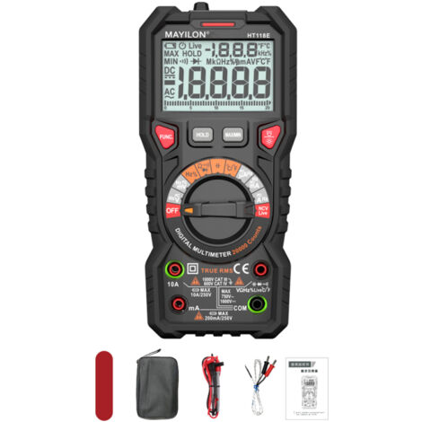 Comment utiliser : 1., Avant d'utiliser le compteur universel, vous devez « ajuster mécaniquement le zéro » et ne pas toucher la partie métallique du stylo de test pendant l'utilisation pour garantir la précision de la mesure et la sécurité des personnes., 2., Lors de la mesure de la quantité électrique, vous ne pouvez pas changer de vitesse pendant la mesure et vous devez faire plus attention lorsque vous mesurez une tension élevée ou courant élevé, sinon le multimètre sera détruit., 3., Si vous devez changer de vitesse, vous devez déconnecter le cordon de test, mesurer après le changement de vitesse et le placer horizontalement lors de l'utilisation, et faire attention à éviter l'influence des champs magnétiques externes sur le multimètre. 【Transport pratique】 Le multimètre à plage automatique a poids léger, une structure compacte, une grande précision et une petite taille, ce qui est facile et pratique à transporter, et peut être mesuré à tout moment 【Fonction d'alarme】 Le multimètre automatique a une fonction d'alarme de changement de couleur. DEX Multimètre LCD ET8134 Multimètre Multifonction LCD Multimètre Automatique Avec Fonction D Accessoires pour ordinateurs Accessoires pour ordinateurs Code EAN: 4770312007269 En-tête / Fabricant: Générique Origine_import: All-in-one Titre: multimètre numérique ET8134, écran LCD 4,7 pouces, mesure de tension cc/ca, capacité de résistance, testeur NCV - 21WYB0802A00043 Multimètre Numérique TRAHOO - Testeur de Tension AC/DC, Résistance... Il est largement utilisé dans l'alimentation électrique, l'électronique et les appareils ménagers. HABOTEST – pince de mesure de courant, multimètre,... – Grandado 【Matériau】 La coque de ce multimètre numérique est en matériau ABS de haute qualité, solide et , résistant à l'usure et à la chaleur La plage maximale de mesure de la capacité est de 60000 uF, le courant minimum peut être mesuré à 0,02 A Multimètre numérique avec fonction True RMS - Mesure de tension en DC et AC jusqu'à 600V