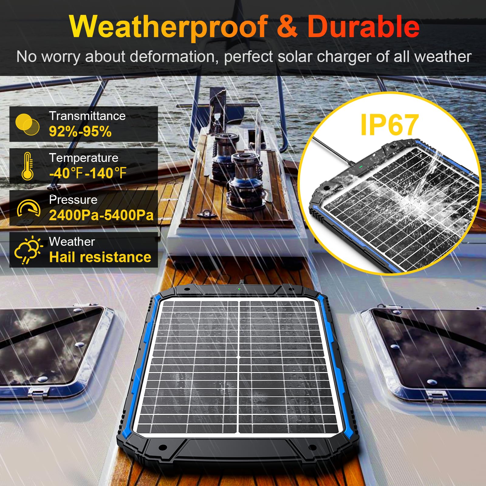 Chargeur de batterie solaire 20 W 20 W Un chargeur de batterie solaire intelligent entièrement automatique et sans soucis pour voiture au plomb scellé de 12 volts pour voiture, automobile, marine, RV, sport motorisé, bateau, remorque à benne, moto, moteur à la traîne, tracteur, VTT et batteries à décharge profonde, y compris les batteries inondées, gel, AGM, SLA et sans entretien, ainsi que les batteries au lithium Lifepo4., Qualité supérieure et matériau : fabriqué avec des cellules solaires de qualité supérieure A+ avec une efficacité allant jusqu'à 21 % à 30 %, verre solaire trempé et cadre durable résistant à la corrosion, résiste aux conditions météorologiques extrêmes telles que les UV, la rouille, l'érosion, la grêle et les tempêtes de sable, jusqu'à 2400 Pa de pression du vent et charge de neige de 5400 Pa. Kit Panneau Solaire Extérieur 200W 12V - Chargeur Contrôleur de Batterie pour Bateau Caravane - Bricolage Le chargeur solaire convertit l'énergie lumineuse du soleil en 12 V CC qui est ensuite transportée vers les batteries rechargeables via le fil de plomb et le connecteur de votre choix, remplacez l'auto-décharge d'une batterie en stockage, de sorte que la batterie ne se dégrade pas La charge sera coupée lorsque la batterie est complètement chargée, et reprend automatiquement lorsque la batterie n'est pas pleine, entretien totalement gratuit. Suner Pro Chargeur Batterie Panneaux Solaires Chargeur Et Mainteneur De Batterie Solaire étanche 12 V U2013 Panneau Chargeur Batterie Panneaux Photovoltaïques Solar Battery Charger Technologie UltraSmart MPPT : ce chargeur de batterie à panneau solaire 12 V est fabriqué avec la technologie unique UltraSmart MPPT de Suner Power, de sorte que toutes ses pièces principales, y compris son contrôleur de charge MPPT et son panneau solaire sont construites à partir de matériaux de qualité supérieure et durables. 【Charge améliorée en 3 étapes】L'algorithme de charge amélioré en 3 étapes (vrac, absorption, flotteur) permet de charger la batterie de 12 volts plus efficacement, garantit que la batterie est rechargée en toute sécurité et augmente la durée de vie et la performance de la batterie. La technologie innovante MPPT-Charge-Controller-Technology permet de fournir une efficacité de suivi élevée allant jusqu'à 99 % et une efficacité de conversion maximale de 98 %, améliorant environ 20 % à 30 % taux d'utilisation par rapport aux autres concurrents. Kit de panneau solaire SOLPERK 50 W 12 V, chargeur de batterie solaire...
