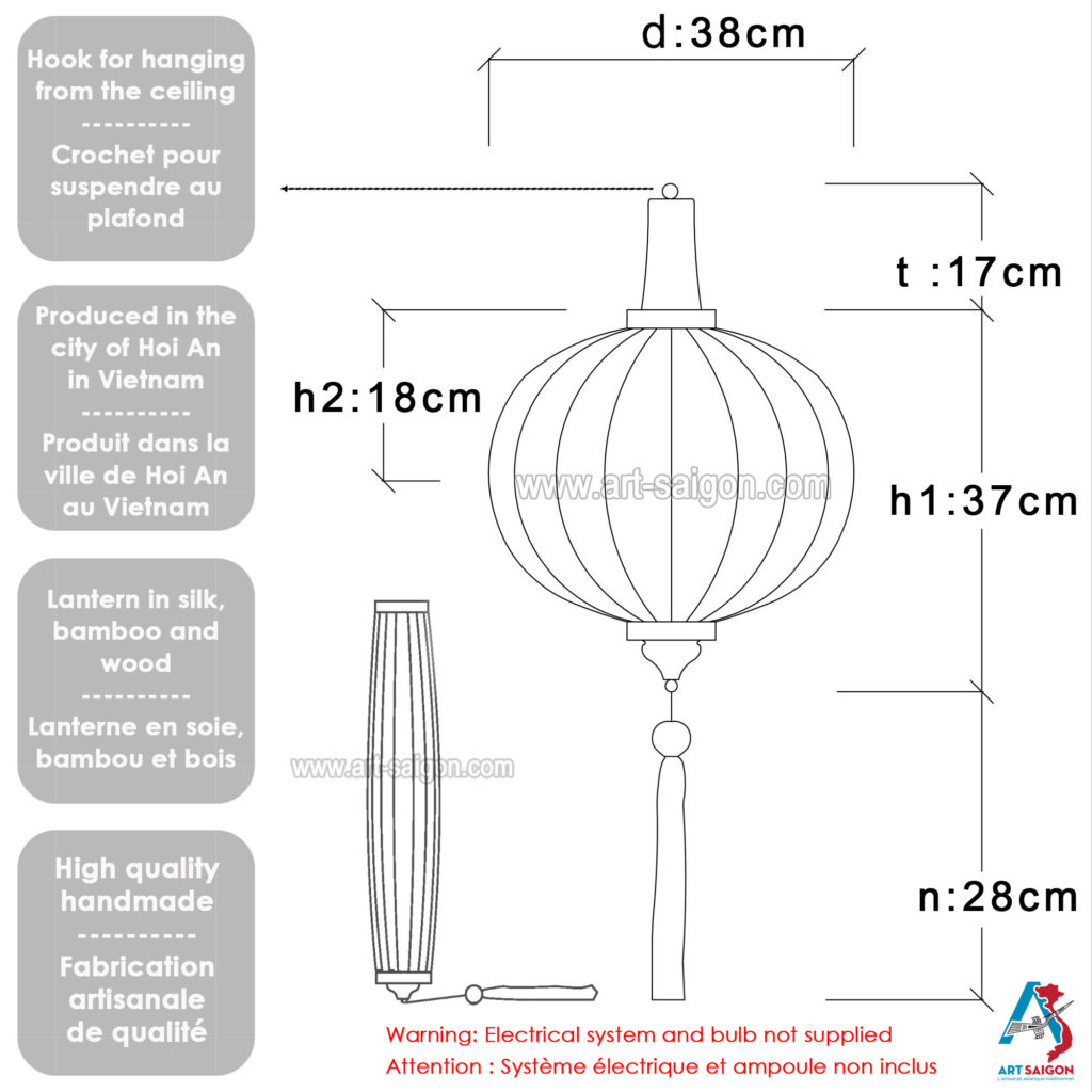 Veuillez nous envoyer un e-mail, nous vous répondrons dans les plus brefs délais. Avant chaque envoi, nos lanternes sont montées et vérifiées afin de vous garantir une qualité optimale. Toute la fabrication d’une lanterne est faite entièrement à la main avec des techniques traditionnelles d’autrefois. Prix d'origine 89,78 € (43 % de réduction) · Lanterne en soie et bambou Hoi An 35... Elles sont faciles à monter et une notice pour le montage est fournie. NOS LAMPIONS ET LANTERNES EN TISSU DE SOIE DU VIETNAM – DÉCORATION ET ARTISANAT ASIATIQUE Nos lampions traditionnels asiatiques proviennent de la ville de Hoi An au Vietnam. L’ampoule et le système électrique pour l’éclairage ne sont pas inclus. C'est une soie naturelle à base de ver à soie composé de motifs asiatiques brodés et très discrets qui ne se voit quasiment plus quand le lampion est éclairé. ARTISANAT & ORIGINE] Nos jolis lampions ou lanternes asiatiques sont fabriqués dans la belle ville de Hội An au Viêtnam par un petit atelier familial Notre service client est à votre disposition si vous avez des questions. C'est un achat responsable qui permet de perpétuer et de transmettre le savoir-faire ancestral de nos artisans vietnamiens aux générations futures. Les couleurs réelles du produit peuvent être légèrement différentes par rapport à celle des photos affichées selon les paramètres d’affichage de votre écran. Un commerce plus équitable et durable qui respecte notre charte éthique et de qualité. Bambou Decoration Lanterne Lampion Asiatique En Soie Rouge, G 33cm - Lustre Suspension Traditionnel De Hoi An En Tissu, Bambou Et Bois - Décoration Et Artisanat Du Vietnam (G25-R Lanterne Bois C'est un cadeau original et sans aucun doute très apprécier. Bien que réalisés au Vietnam, beaucoup de nos clients à la recherche de lanternes chinoises ou asiatiques sont plus que satisfaits de nos lanternes traditionnelles de qualité supérieure Il faut compter 7 étapes dans le processus de sa fabrication artisanale Witwe Unangemessen Sprichwort der lampion amazon sinken Überlegenheit ergänze Il respecte notre charte éthique et de qualité pour un commerce plus équitable et durable. ✅【DÉCORATION & IDÉE CADEAU】 Pour tous les amoureux de la culture asiatique, nos beaux lampions sont une merveilleuse façon de décorer votre maison et d’y apporter un charme asiatique. En raison des matières premières utilisés (soie, bambou, bois), il est préférable de l'utiliser en intérieur pour conserver sa beauté plus longtemps. Elles sont fabriquées par un petit atelier familial dont nous sommes partenaires depuis plusieurs années. ✅【CONSEILS D'UTILISATION】 Toutes nos lanternes disposent d'un crochet métallique situé sur le dessus pour les accrocher facilement.
