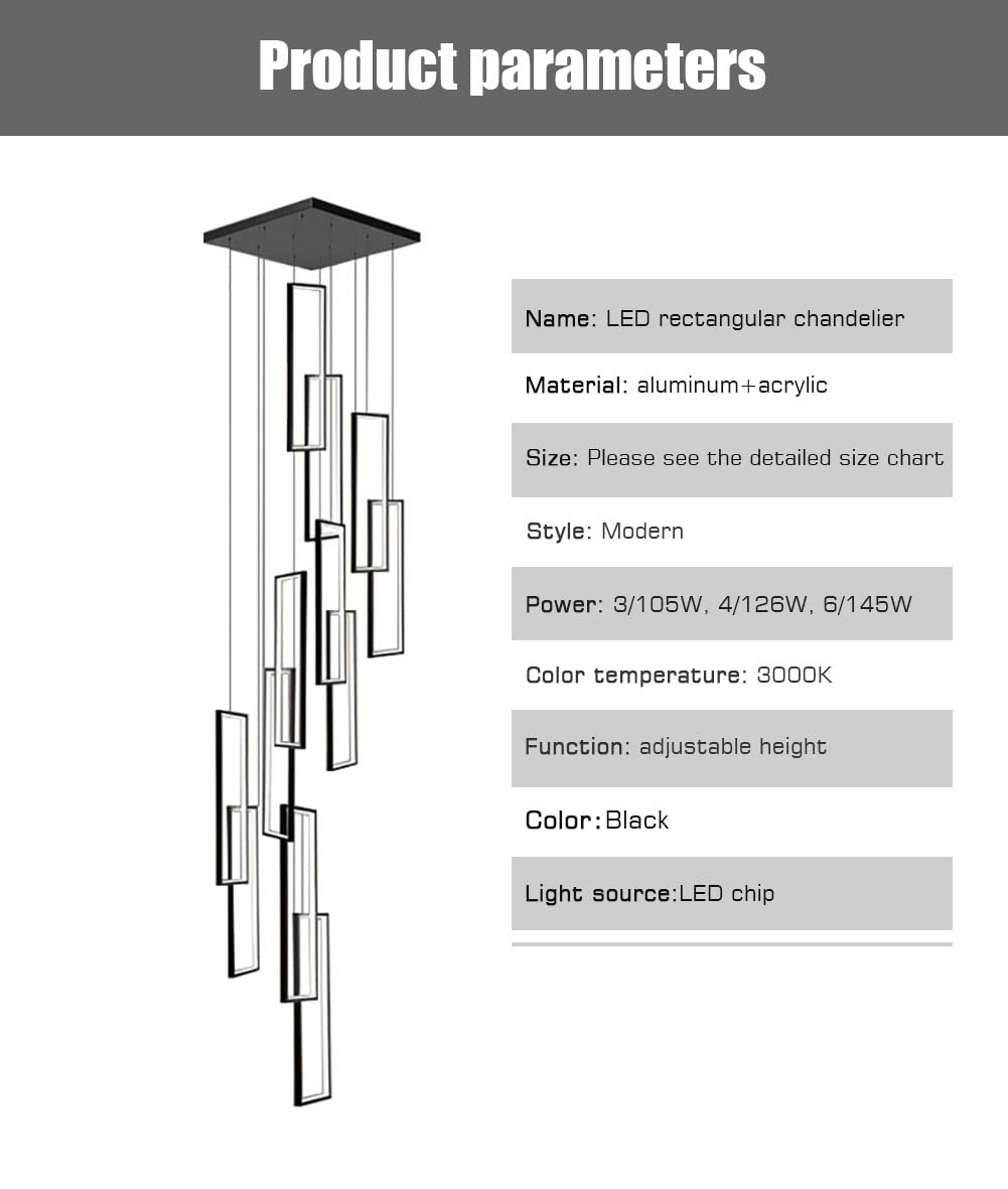 Corps de lampe en aluminium noir, classique et élégant. Parfait pour les escaliers, loft, villa, salon, etc. Bien entendu, vous pouvez l’installer où vous le souhaitez car il est réglable en hauteur pour s’adapter à différentes hauteurs de plafond. Suspension LED Moderne Lampe à Suspension Table à Manger Lustre de Paramètres du produit :Matériel: aluminium + acryliqueTempérature de couleur : blanc chaud 3000KCouleur: NoirSource de lumière : puce LEDPuissance : 3 lumières/105 W, 4 lumières/126 W, 6 lumières/144 WHauteur réglable :3 lumières/79 pouces4 lumières/98 pouces6 lumières/118 poucesCandidatureIl s'agit d'un lustre réglable de 100W. Les puces LED de marque célèbre garantissent une luminosité élevée, une lumière uniforme et non éblouissante. Éclairage économe en énergie : équipé d'une technologie LED avancée, ce lustre rectangulaire LED moderne fournit un éclairage lumineux tout en réduisant la... 【PLACES APPLICABLES】Ce lustre convient aux escaliers en colimaçon, aux hauts plafonds, aux villas, aux salles à manger, aux hôtels, aux halls d'entrée. 【INSTALLATION FACILE】Tous les câbles du lustre sont pré-connectés, vous serez étonné de voir à quel point il est beau lorsque vous l'installerez. 【CONCEPTION CRÉATIVE】Le dernier design de lustre double rectangulaire, le style actuel, la combinaison d'aluminium + acrylique assure un poids léger et une bonne dissipation thermique assure une durée de vie plus longue. 【ACHETEZ EN TOUTE CONFIANCE】Nos produits sont accompagnés d'une garantie de 3 ans, d'un remplacement ou de pièces de rechange gratuits. 100 % de diffusion lumineuse. Pour les la technologie LED. ... de temps pour devenir plus lumineuses. lumière du jour se situant à 6500 kelvins. ... nomiques... Lustre Rectangulaire Noir, Lustre D'escalier à LED, Suspension Source de lumière : puce LED.