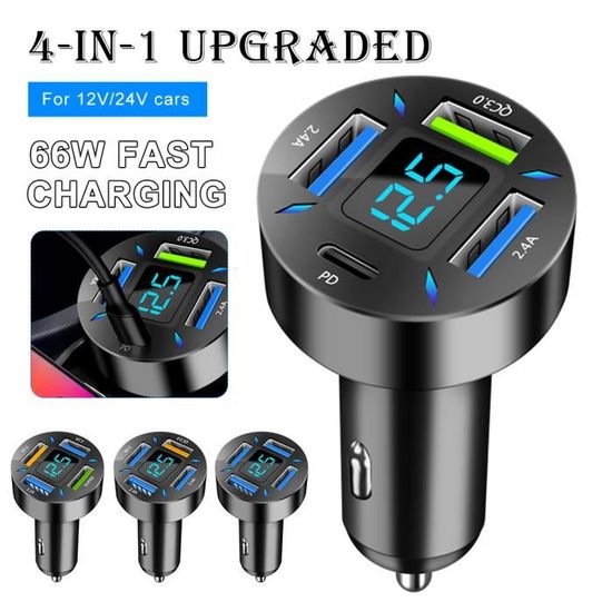 Modèles compatibles : design universel compatible avec la plupart des véhicules sur le marché, voitures, camions ou camionnettes, etc. Chargement rapide : haute efficacité de charge, 30 minutes pour remplir 80 % de la puissance, par rapport au chargeur multi-voiture général, charge plus rapide, stable et rapide pour gagner du temps, mais également pour protéger la performance de votre batterie, de sorte que vous n'avez pas à vous soucier de l'urgence de la batterie. La plage normale avant le démarrage est de 23,2 V-25,6 V, et la plage normale après le démarrage est de 23,2 V-27,2 V. Détection de tension : le port USB de la voiture est livré avec un affichage numérique LED pour suivre l'état de santé de la voiture grâce à la détection de tension. Le port de charge est compatible avec iPhone 15/14/13/12/11, Huawei Mate 60/50/40, Xiaomi 14/13/12, ventilateurs portables, tablettes et autres appareils électroniques. 6 ports USB, dont 1 port SCP/QC3., 0, 2 ports 3., 1A, 2 ports PD et 1 port de charge super rapide. Adaptateur De Chargeur De Voiture Usb 4 Ports, Qc3.0 Port Dc 12-24V... ★ Puissance de sortie : 27 W. Plusieurs ports peuvent être chargés ensemble, ce qui en fait un incontournable pour vous et votre famille pour profiter de la route lorsque vous avez plusieurs appareils lors d'un long voyage. Avec ce produit, vous pouvez clairement comprendre l'état de santé de votre voiture. Chargeur De Voiture Double Usb, 12V-24V 36W Qc3.0 Adaptateur De Charge Peut protéger efficacement la surcharge automobile et la haute tension provoquée par une série de problèmes. Wonima22 Chargeur De Voiture Rapide 6 Ports Avec Moniteur De Mod Les An Les modèles 12 V et 24 V ont différentes valeurs de détection de tension, veuillez vous référer à la description spécifique pour plus de détails. Puce intelligente : par rapport à la charge de voiture de mauvaise qualité sur le marché, en tenant compte des besoins des utilisateurs sous divers aspects, nos produits après de nombreuses expériences, ont été mis à niveau vers une puce intelligente intégrée avec protection contre les surtensions, les surintensités, les surchauffes, les courts-circuits. Chargeur de voiture à 6 ports : avec ce chargeur de voiture USB, vous pouvez considérablement augmenter l'espace de charge dans votre voiture. Chargeur de voiture USB 6 Ports, charge rapide, Type C, adaptateur de chargeur de voiture PD pour IPhone 15 14 Xiaomi Huawei Samsung QC3.0. 3 vendus. 0,99 Les modèles 24 V ont une valeur anormale de 23,2 V ou 27,2 V, la plage normale avant le démarrage est de 23,2 V-25,6 V, et la plage normale après le démarrage est de 23,2 V-27,2 V.