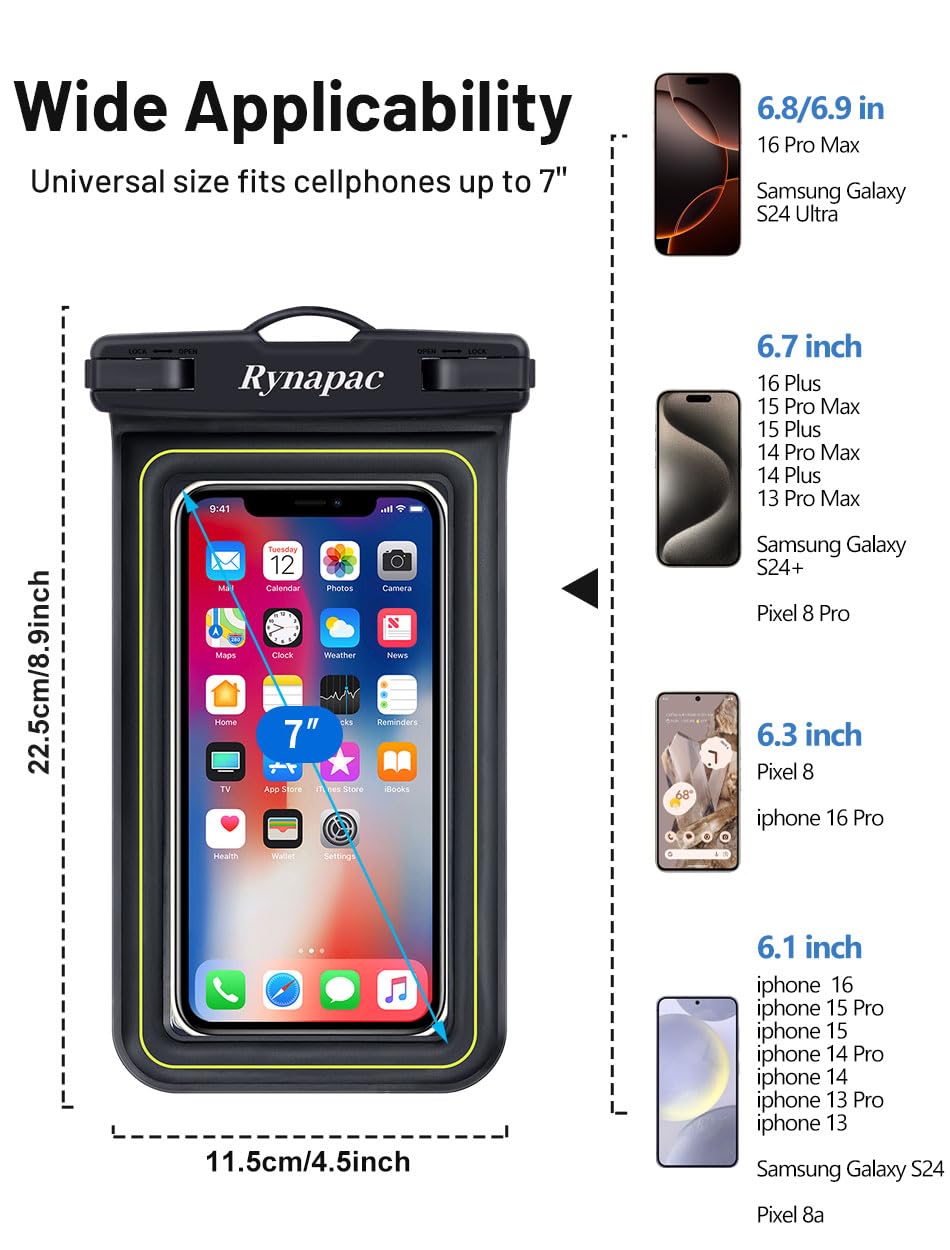 Lot De 2 Pochettes Flottantes Étanches Pour Téléphone (Système De [Compagnon de voyage essentiel] : un sac étanche fiable pour téléphone est un essentiel de voyage, que vous soyez en croisière ou que vous profitiez d'une excursion ensoleillée à la plage. Accessoires de plage indispensables pour les vacances : l'étui étanche Rynapac est spécialement conçu pour les activités de plein air telles que les piscines, la plage, la pêche, la natation, la voile, le ski, le bateau, le kayak, la plongée avec tuba, le tubing, le rafting et d'autres activités de parc aquatique. En cas de problème, n'hésitez pas à contacter l'équipe d'assistance Rynapac. Pochette Pour Téléphone Portable Pochette De Téléphone étanche Flottante, IPX8 Double Espace Pour IPhone 15, 14, 13 Pro Max Plus, Samsung Galaxy S23 S22 Ultra, Cordon Amovible, Essentiels Pour Bateau De Croisière (vert Clair Pochette Telephone étanche (Lisez attentivement les précautions avant d'utiliser la pochette étanche. Veuillez enlever les objets sous le support supérieur pour éviter l'entrée de l'eau). Testez la fonction imperméable avec une serviette en papier avant chaque utilisation, pressez l'air avant de sceller, et immergez dans l'eau pendant environ 10 minutes. Essentiels pour les vacances : le design de grande capacité soutient parfaitement votre téléphone jusqu'à 19,1 cm, empêchant efficacement les chutes accidentelles, les rayures et l'eau. Accessoires de voyage : ce support de téléphone étanche est conçu avec un aspect PVC transparent, les boutons latéraux sont faciles à utiliser. Large application : sac étanche de taille universelle, compatible avec les téléphones portables jusqu'à 9,9 x 17,5 cm (fenêtre transparente 8,1 x 16,3 cm), le téléphone portable peut être installé en toute sécurité dans la pochette étanche pour téléphone (convient aux téléphones portables jusqu'à 17,5 cm avec les coques... La technologie de verrouillage à trois couches de Rynapac garantit une étanchéité certifiée IPX8, offrant une protection complète pour la pochette étanche du téléphone contre l'eau, la neige, la poussière et le sable.