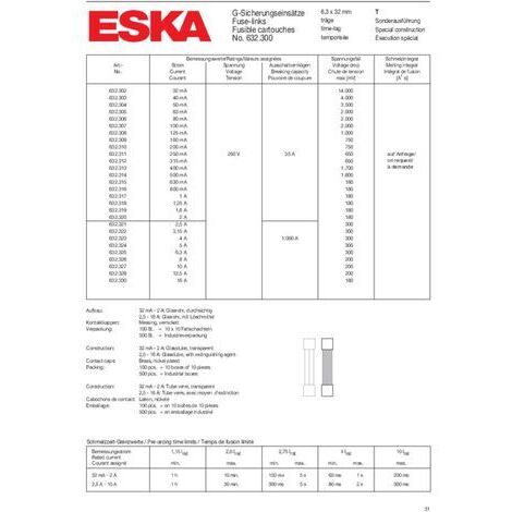 Genre de la emballage: sac Plaquage du contact: nickelé Série du fabricant: 632., 300 Description Tube de verre transparent 0,032 A à 2 A avec puissance de coupure 35 A, tube de céramique 2,5 A à 16 A avec sable et puissance de coupure 1000 A Lot de 10 fusibles temporisés ESKA – 63mA, 250VAC, format 5x20mm, en laiton. Parfaits pour protéger les équipements électriques sensibles contre les... Fusible Rectangulaire Temporisé Type 392 5A 250V Micro-fusible ESKA 632.328 ( x L) 6.3 mm x 32 mm 12.5 A 250 V temporisé -T- 10 pc(s) S51976