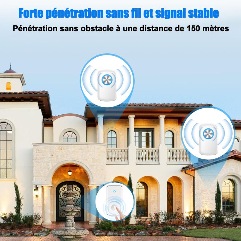 Peut fournir des sonneries fortes et claires pour répondre à vos différents besoins. Il garantit également un fonctionnement normal dans diverses conditions météorologiques lorsqu'il est utilisé à l'extérieur. 2K Fhd Sonnette Sans Fil Avec Camera, Sonnette Sans Fil Exterieur... 【Volume Réglable à Cinq Niveaux et Large Gamme de Musique】Cette sonnette sans fil étanche d'extérieur est équipée de cinq niveaux de volume réglables pour garantir un son clair dans différents environnements. Doorbell convient aux appartements, usines, maisons, bureaux. Que vous soyez locataire ou propriétaire de votre propre maison, il peut être facilement installé sans endommager vos murs. Cela garantit une réception stable, sans interférence d'autres appareils, même dans une grande maison ou un jardin spacieux, afin que vous ne manquiez aucun visiteur. Sonnette Sans Fil Exterieur Puissante, Ip55 Étanche Electronique Kit Les sonnettes sans fil avec lumières LED bleues clignotantes fournissent un signal visuel fort lorsqu'elles s'allument lorsqu'elles sont utilisées. Vous pouvez le placer n'importe où dans votre maison, cuisine, jardin, bureau, magasin, boîte aux lettres. De plus, la sonnette extérieure sans fil étanche dispose de 6 niveaux de volume, réglables de 0dB (silencieux) à 115dB. Sonnette étanche Sans Fil Sonnette Sans Fil Exterieur Etanche, ELEPOWSTAR Carillon De Porte à 300 Mètres De Portée, LED Sonette Sans Fil Sonnette sans Fil, Exterieur Etanche à 400M de Portée, Kit de Carillon... 【Lumière LED Clignotante】Le récepteur et l'émetteur de la sonnette sans-fil sont équipés d'une LED clignotante comme notification visuelle. 【Conception étanche】La sonnette sans fil intelligente est alimentée par batterie et convient à une utilisation en extérieur, résistant efficacement à la pluie et aux éclaboussures quotidiennes, garantissant un fonctionnement normal dans diverses conditions météorologiques.
