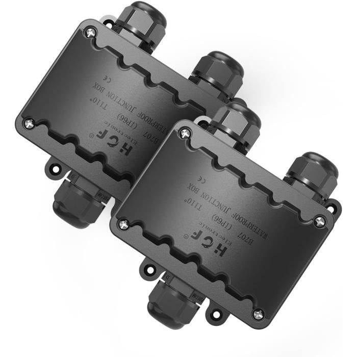 Contenu : 2 boîtes de jonction étanches., 4 vis. Matériau de qualité supérieure : la boîte de jonction est fabriquée en plastique PP de haute qualité (94-V2). Walfront Lot de 3 connecteurs étanches IP68 à 3 voies, câble électrique Câbles 2 broches/3 broches : le connecteur de fil est compatible avec les câbles de 4 à 8 mm de diamètre. Caractéristiques : Matériau : polyamide eP (nylon PA66). Étanche et résistant à la poussière : boîte de jonction étanche IP66, les deux extrémités sont livrées avec des connecteurs étanches PG9, et la bague d'étanchéité pour une protection contre la pluie. Description du produit : Caractéristiques : 1., La boîte de jonction fournit un moyen rapide et facile de réparer et prolonger les câbles d'alimentation., 2., IP66 étanche à l'eau et à la poussière, protection UV et boîte de jonction résistante à la pluie., 3., Les deux extrémités sont dotées d'un presse-étoupe étanche PG9, une boîte de jonction étanche IP66 pour empêcher la poussière d'entrer dans la boîte et garder le câble électrique propre., 4., Matériau de haute qualité : polyamide eP (nylon PA66), résistant à l'acide, aux alcalins et à l'alcool, résistant à la chaleur, ignifuge, etc. Courant du bloc : 32 A. 3 voies : 130 mm x 80 mm x 32 mm. Tension nominale : inférieure ou égale à 450 V. Gamme de câble : 4 mm à 12 mm de diamètre. PEBA Connecteurs de Câbles Étanches IP68 - Boîte de jonction 3 voies... Matériau de la boîte de dérivation : polyamide eP (nylon PA66), résistant à l'acide, aux alcalins et à l'alcool, résistant à la chaleur, ignifuge, etc. Rallonge Exterieure étanche Connecteur De Câble étanche IP68 à 3 Voies, Boîte De Jonction Exterieure 450 V 32 A 99145093 Connecteur Boite Jonction Extérieur Capacité de câblage : 4-8 mm. Utilisation simple et sûre. Sécurité pour la réparation de câble d'alimentation à l'intérieur et à l'extérieur. Courant du bloc terminal : 32 A. Température de fonctionnement : -40 °C à 100 °C, maximum jusqu'à 120 °C.