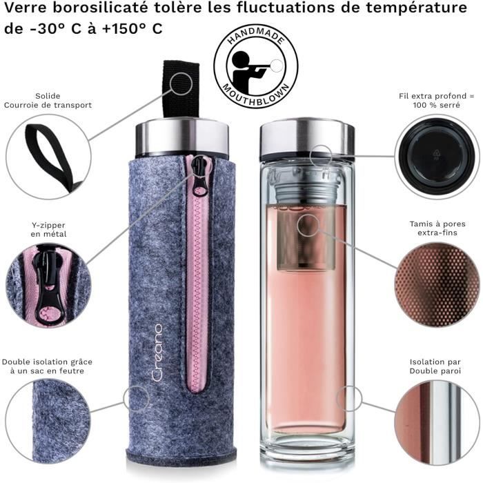 Théière et bouteille isotherme 2 en 1La bouteille 2 en 1 vous permet non seulement d'infuser votre thé mais aussi de le garder au chaud. Retour de marchandises vérifié à un prix imbattable - avec 24 mois de garantie ! Garde votre boisson chaude ou froide pendant longtemps Filtre en acier inoxydable pour la préparation du thé dans la bouteille Verre borosilicaté robuste avec fond renforcé Housse de protection, avec une pratique sangle de transport Description du produit: Bouteille isotherme et infuseur de thé en un... Cucina di Modena Bouteille à thé isotherme à double paroi et housse, 400 ml Double paroi isolante et housse en polychloroprène : maintient la boisson au chaud ou au frais • Verre borosilicate robuste à double paroi et fond renforcé • Bouchon à vis de haute qualité avec revêtement en bambou Maintient la température de votre boisson* Bouteille à thé isotherme, 400 ml par Cucina DimodenaThéière et bouteille isotherme 2 en 1 Le filtre peut ensuite être retiré en toute simplicité grâce à son anse. Sans poignée ni bec verseur, la bouteille se glisse dans toutes les poches. Bouteille à thé, filtre en 2 parties, couvercle à visser, housse en polychloroprène. La double paroi et la housse se chargent, pour leur part, d'isoler la boisson et de protéger vos doigts. Garde votre boisson au chaud ou au froid pendant très longtemps • Passoire en acier inoxydable pour la préparation du thé dans la bouteille • Verre borosilicaté robuste avec une base renforcée • étui de protection, avec sangle de transport pratique Gourde The Italy Home Design Boîte à Repas Isotherme, Boite à Déjeuner INOX Double Paroi, Lunch Box 650 Ml Gourde Infusion La bouteille 2 en 1 vous permet non seulement d'infuser votre thé mais aussi de le garder au chaud. Placez les feuilles dans le filtre à mailles fines pour une... Original Bouteille Infuseur À Thé Isotherme 750Ml En Inox Thé & Fruits, Gourde Isotherme
