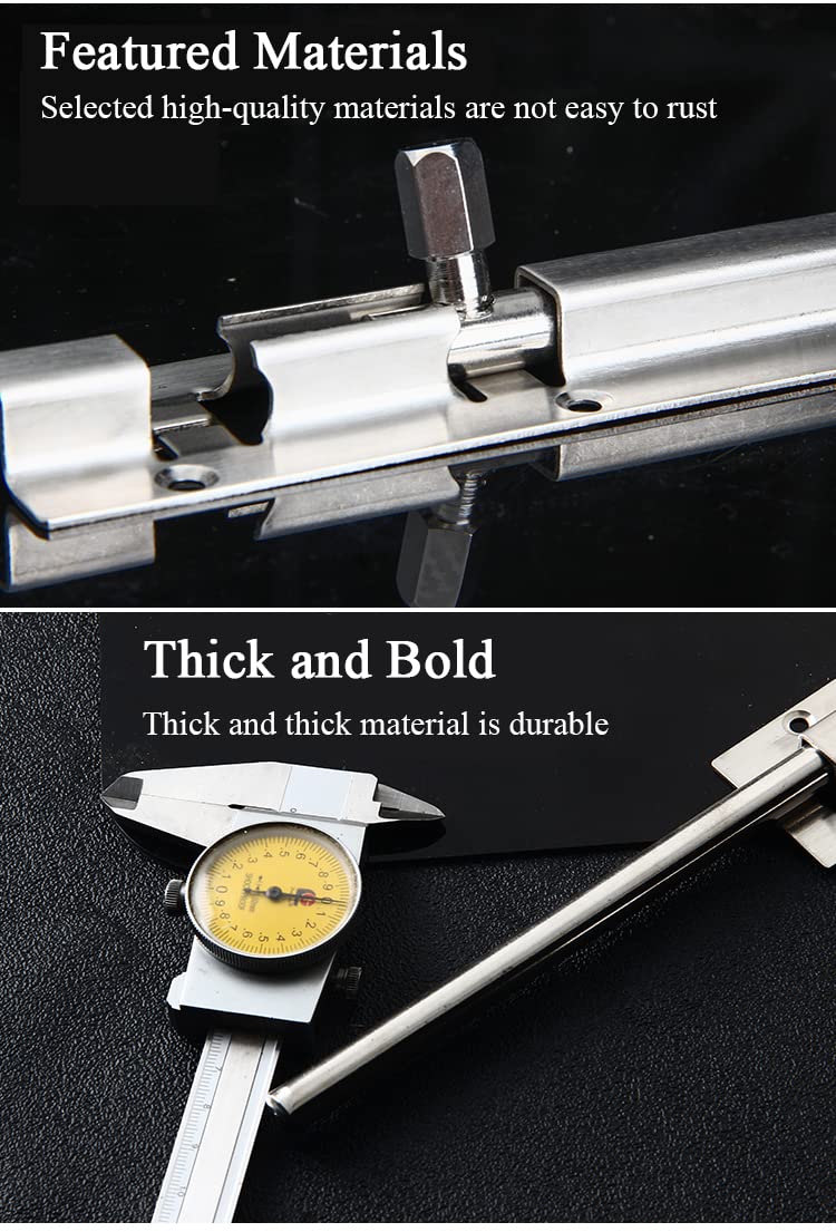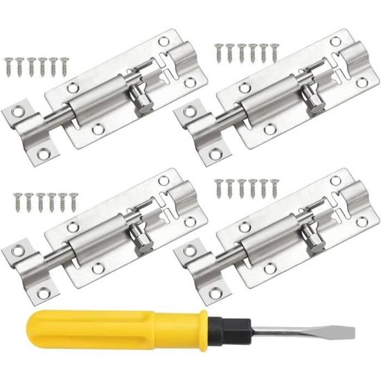 Acier inoxydable Verrous Noir pour portes et loquets pour Porte de Offre assez de résistance et de stabilité pour n'importe quelle porte. Dimensions : 75 mm x 35 mm (L x l)., Couleur : argenté., Quantité : 4 paquets., Contenu : 4 verrous coulissants., 24 vis. Convient pour les portes, coffres, armoires, mèches en bois, fenêtres, clôtures, niches, salle de bain, chambre, bar, etc. Lot De 4 Verrous Coulissants En Acier Inoxydable épais Avec Installez-le sur la porte en bois et vissez-le directement avec un tournevis. Le verrou coulissant pour abri de jardin ajoutera de la sécurité aux portes de garage et gardera le bétail en sécurité. L'action du verrou coulissant fournit un mécanisme de fermeture solide, il peut être inséré pour sécuriser la porte, offrant assez de force et de stabilité pour n'importe quelle porte. Le verrou de sécurité en acier inoxydable peut être installé verticalement ou horizontalement. Taille de la serrure de porte coulissante en acier inoxydable, corps du boulon principal : 75 x 35 mm (L x l) ; récepteur : 14 x 35 mm (L x l) et diamètre du trou de montage : 4 mm. Verrou de porte antivol - est fabriqué en acier inoxydable épais, qui est solide et ne rouille pas facilement. La position des vis du trou fraisé est conçue... Caractéristiques : Matériau : acier inoxydable.