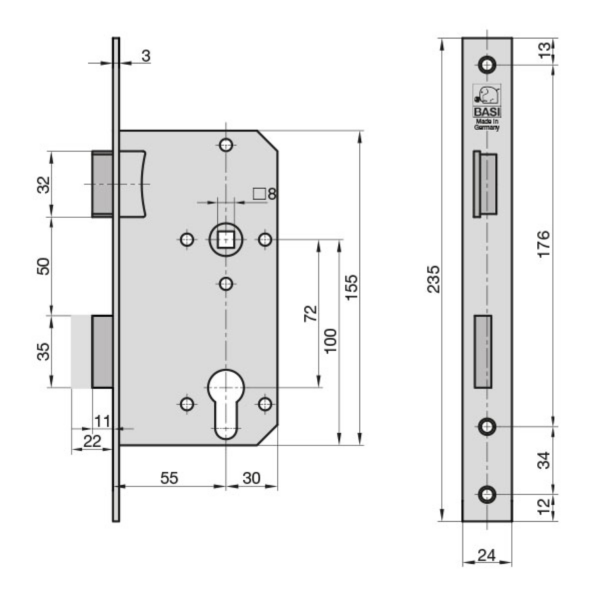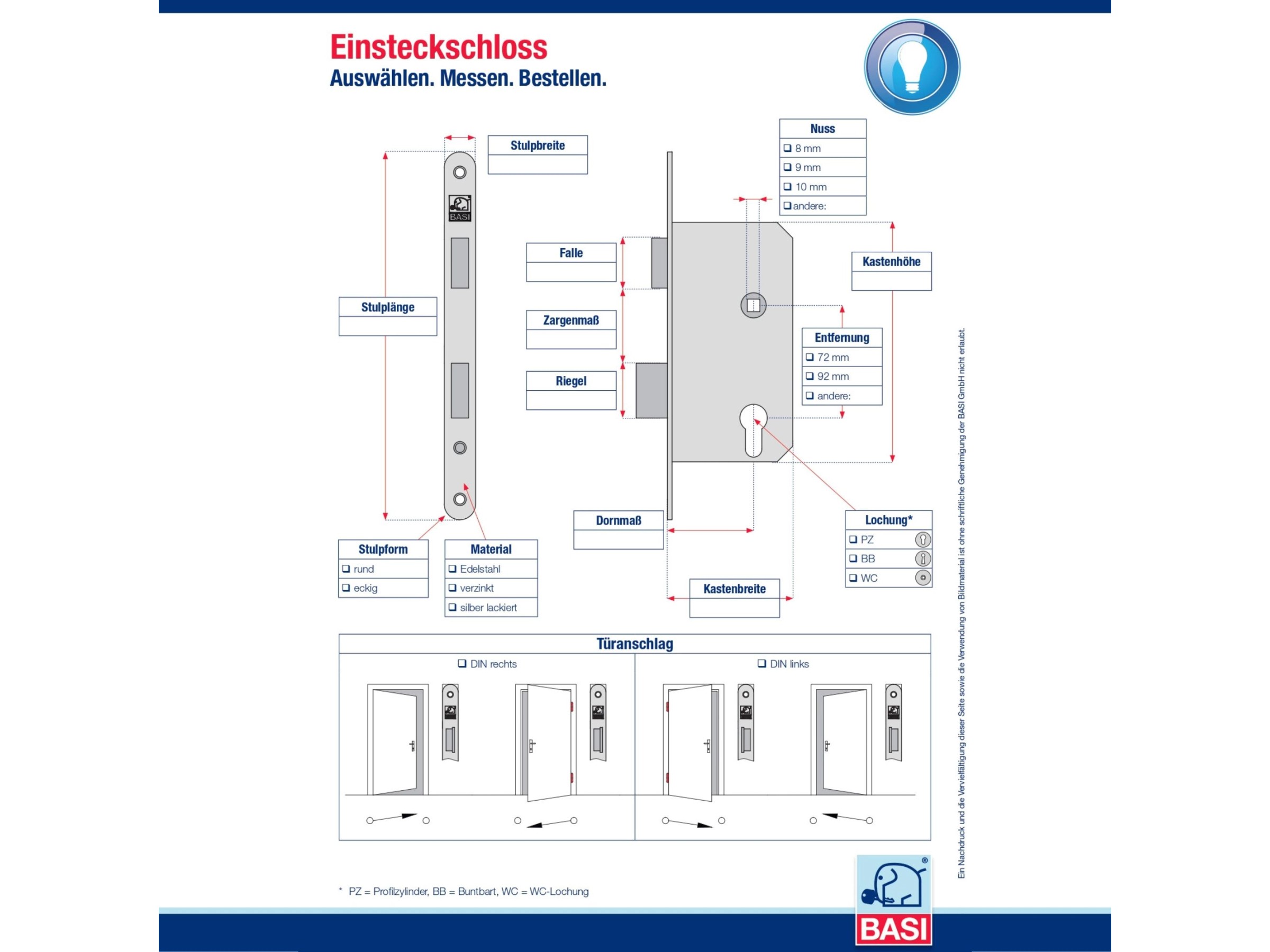 Caractéristiques et caractéristiques techniques : Caractéristiques techniques : Pour portes pliées. Contenu : Serrure à larder (au choix)., Facture avec TVA. Einsteckschloss für Zimmertüren BKS 0415 | Wagner Sicherheit Perforation pour cylindre profilé avec changement. Matériau : nickel (laqué argent). Piège et loquet en métal Distance au canon (A Conforme à la norme DIN 1825-1., Classe 2., Poids : 493 g. Serrure Marc Basi Silber 9250-5521 Einsteck-Zimmertürschloss Thirard Serrure Direction DIN à droite ou à gauche. Piège et loquet en métal Distance au canon (A) : 55 mm (voir image 2) Entraxe (B) 72 mm (voir image 2) Longueur de la têtière (C) 235 mm (voir image 2) Largeur de la têtière : 20 mm. Perforation pour cylindre profilé avec changement. Beschreibung BASI Einsteckschloss ES925 für gefälzte Türen. Das Einsteckschloss eignet sich für Profilzylinder und besitzt eine Wechselfunktion. Ideal zur Verwendung von Eingangstüren / Zimmertüren, die mit einem Schließzylinder ausgestattet werden sollen. Eigenschaften Falle/Riegel Metall Stichwörter 04026434007442, Basi, 9250-5521, ES...