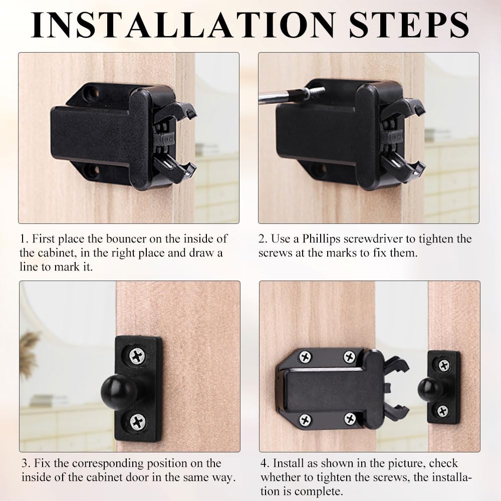 Il suffit de pousser pour libérer le mécanisme de verrouillage pour une expérience d'ouverture fluide et homogène. Convient pour les maisons, les bureaux, les hôtels, et diverses solutions de meubles et de stockage, offrant commodité et sécurité dans tous les environnements. Conçus avec un matériau ABS de qualité supérieure et de l'acier inoxydable, nos loquets de porte garantissent durabilité et résistance à l'usure. Utilisez-les dans les armoires, armoires, tiroirs, etc. Cette caractéristique est particulièrement bénéfique pour les designs modernes et minimalistes, améliorant l'esthétique de vos armoires et placards sans avoir besoin de poignées saillantes. Améliorez vos meubles et solutions de rangement avec ces loquets de porte magnétiques de haute qualité, et profitez d'un environnement plus efficace et esthétique. Le mécanisme à ressort fiable garantit une fermeture constante à chaque fois. Lot de 4 loquets de porte magnétiques à pousser pour ouvrir Chaque lot comprend toutes les vis de fixation nécessaires, ce qui rend l'installation un jeu d'enfant. Fixez simplement le bourrage magnétique à chaque porte de placard et la longue feuille magnétique à chaque panneau latéral. Loquet Magnétique Pour Porte D'armoire, Ferme-porte Coulissant Avec Vis Et Autocollant Pour Armoires Portes Coulissantes 4 Pieces 99082868 Cette construction empêche les ouvertures ou fermetures accidentelles, offrant une performance fiable à chaque utilisation. Profitez d'une fonctionnalité sans effort en un rien de temps. Améliorez votre maison et votre bureau avec notre lot de 4 loquets de porte magnétiques pour armoires. Le mécanisme d'ouverture simplifie le fonctionnement de la porte. Fixez un bourrage de porte magnétique à chaque porte de garde-robe et une longue feuille magnétique sur chaque panneau latéral pour une installation rapide et simple. Parfait pour les designs modernes et minimalistes dans les armoires et les armoires. Installation facile : conçus pour une installation sans tracas, ces loquets de porte à pousser nécessitent un minimum d'outils. Avec notre lot de 4 loquets de porte magnétiques à pousser pour ouvrir, découvrez le mélange parfait de commodité, de durabilité et de design moderne. Matériaux durables et de qualité supérieure : fabriqués en ABS et en acier inoxydable, ces loquets de porte à ouverture par pression sont à la fois écologiques et conçus pour durer. Loquet magnétique à pousser : le loquet de porte d'armoire a une structure à ressort interne plus forte et une ventouse magnétique qui peut absorber... Sollbry Lot de 6 loquets à dégagement tactile pour placard – Loquets tactiles non magnétiques... La plus grande base de ferme-porte avec quatre trous assure une rétention sûre, empêchant l'ouverture ou la fermeture accidentelle, idéal pour les portes de cuisine, de salle de bain et de chambre. Ces loquets magnétiques offrent une solution moderne et efficace pour le verrouillage de porte, éliminant le besoin de poignées ou de boutons.
