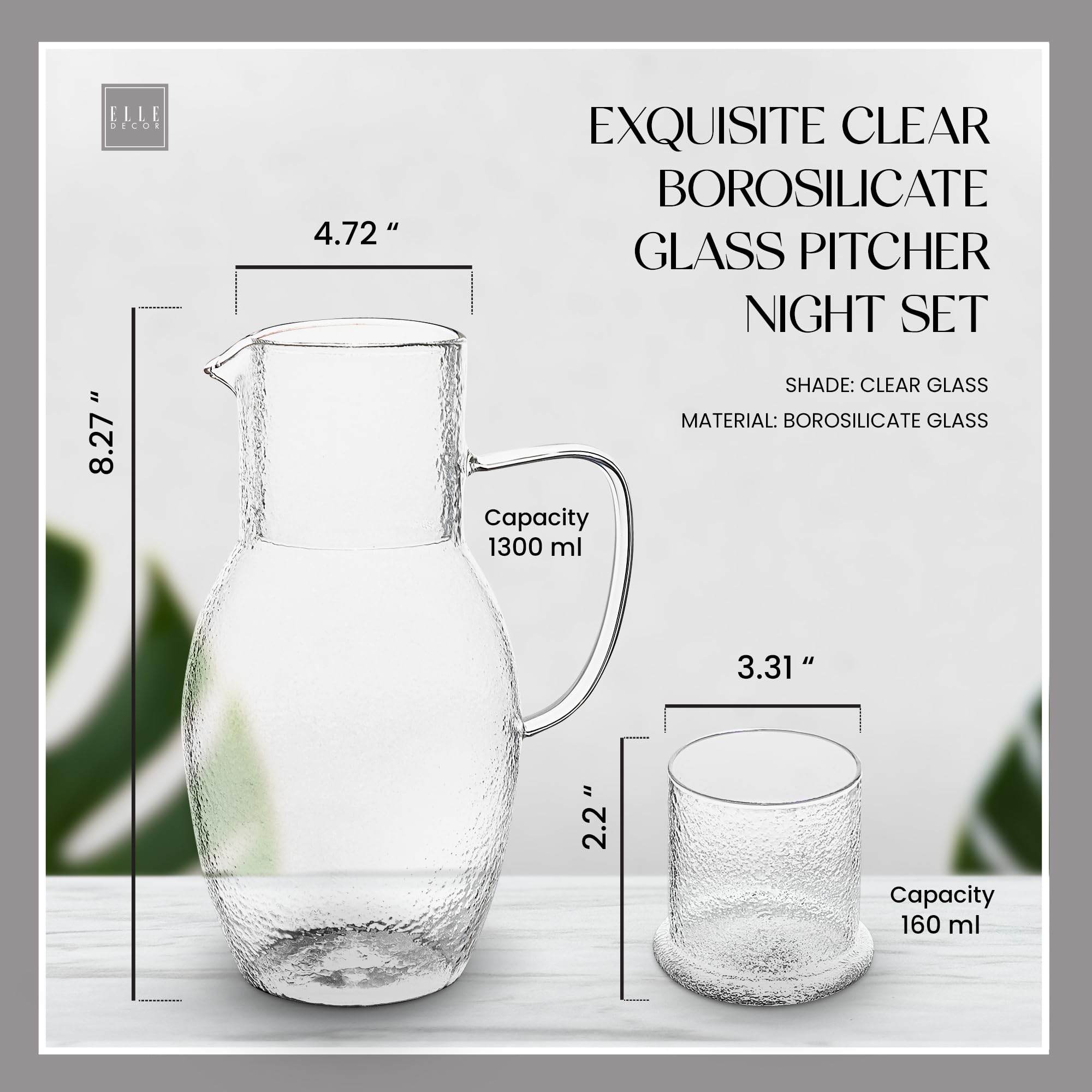 Son gobelet peut être utilisé comme couvercle, s'adapte à l'intérieur de l'ouverture du pichet, vous assurant que vous pouvez profiter d'une délicieuse tasse sans aucune particule de poussière qui pénètre dans votre eau. Soyez assuré que ce lot de pichets est fabriqué à partir de matériaux sans BPA et sans plomb, vous assurant que vous n'obtenez que des boissons pures et délicieuses. Les couvercles sans BPA le rendent sûr pour un usage quotidien, tandis que le design anti-déversement garantit qu'il n'y a pas de désordre à nettoyer. Lavage à la main recommandé pour maintenir son état impeccable. Sûr et pur : améliorez votre expérience de boisson avec le set de nuit Elle Decor Amber qui est fabriqué à partir de matériaux sans BPA et sans plomb, garantissant que vous n'obtenez que des boissons pures et délicieuses. Que vous serviez des boissons lors d'une fête ou que vous cherchiez simplement une façon élégante de rester hydraté, cette carafe est le choix parfait. Pichet De Personnage De Dessin Animé De Boisson Froide Au Citron... Fabriqué à partir de verre borosilicate de haute qualité, cet ensemble de carafe en verre est conçu pour résister à la fois à la chaleur et aux températures froides, vous permettant de profiter d'une variété de boissons chaudes et froides. Alors allez-y et investissez dans cette superbe carafe dès aujourd'hui - vos invités (et vos papilles) vous remercieront. Pichet 12 cm P x 19 cm H, 882 g Tasse en verre 9,9 cm P x 7,9 cm H 240 g. Carafe à eau en verre en forme de vache – Carafe à lait de Fonctionnel et pratique : le design pratique du pichet comprend un bec pratique pour verser facilement et une poignée confortable. Carafe En Verre Avec Couvercle Elle Decor Ensemble Pichet De Chevet | Carafe De 1,2 L Avec Tasse | Gobelet Bedside Carafe Améliorez votre expérience de boisson avec le set de nuit Elle Decor Amber et profitez de chaque gorgée avec style. Matériaux de haute qualité : fabriqué à partir de verre borosilicate durable, ce pichet est conçu pour résister à la fois à la chaleur et aux températures froides, ce qui le rend idéal pour une variété de boissons. Dans l'ensemble, cette carafe est un choix polyvalent, durable et élégant qui fera un ajout élégant à n'importe quelle cuisine ou salle à manger. Pichet avec thé, sirop de médicaments, fruits et inhalateur sur la... Avec sa poignée circulaire distinctive et disponible en deux belles variations de couleurs, ce pichet ajoute une touche d'élégance à n'importe quel décor.