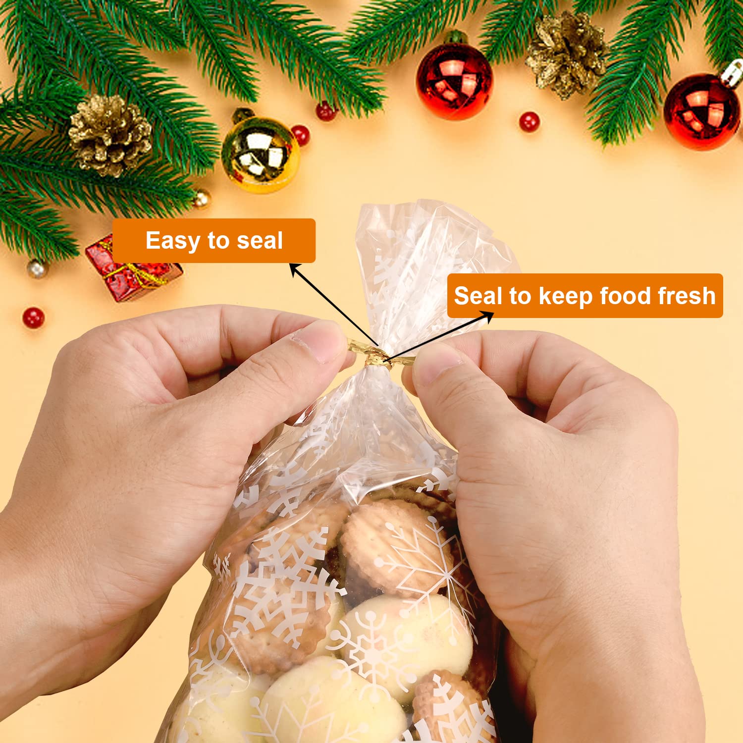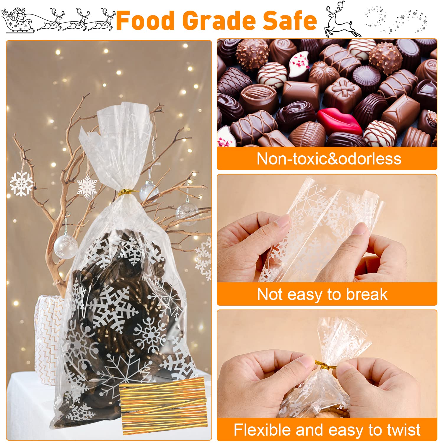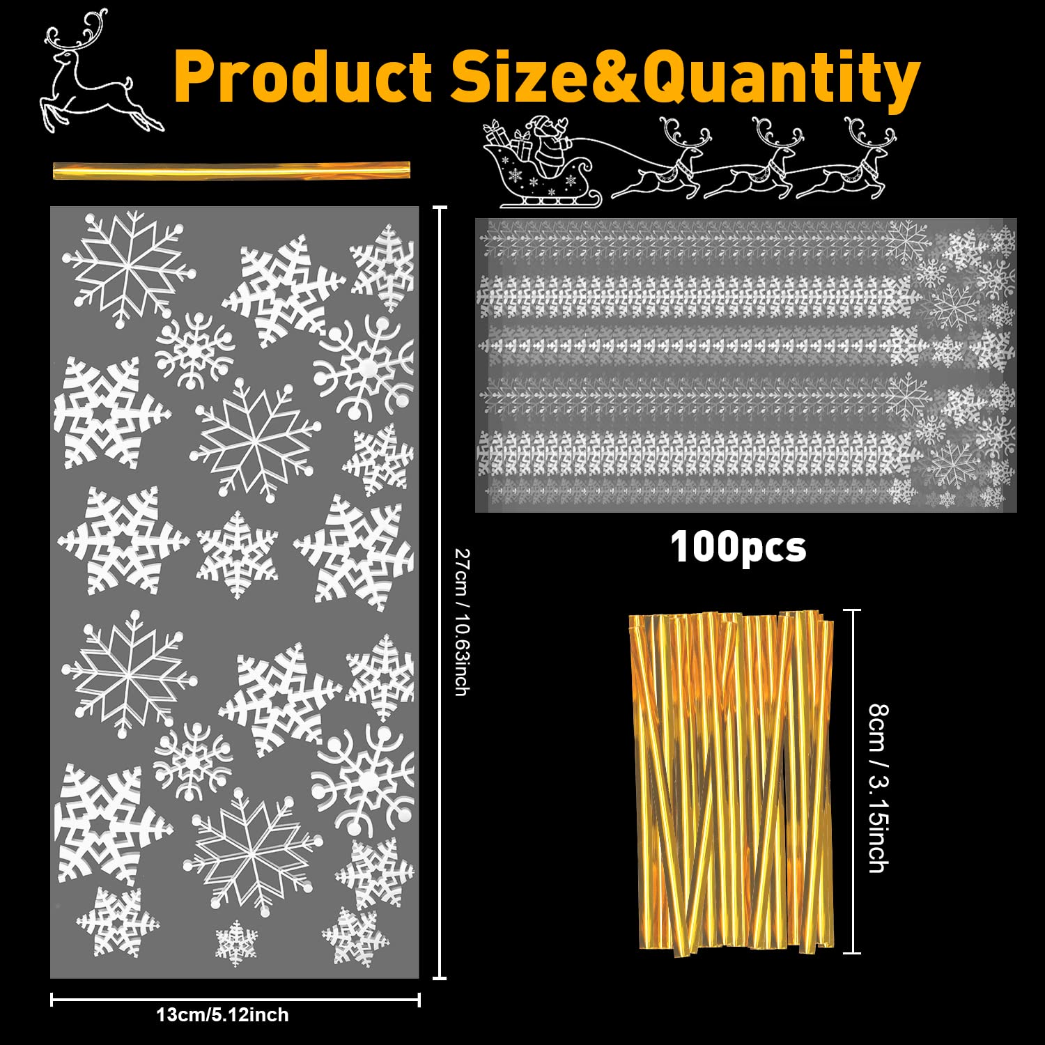 CelloMania Lot de 100 sacs en cellophane auto-scellants A4 - Sacs La surface du sac cadeau de Noël est conçue avec un motif de flocons de neige, et le sac est transparent et en quantité suffisante pour vous. Caractéristiques : sacs en cellophane Quantité : 100 sacs à bonbons de Noël + 100 rubans - Dimensions : 27 cm x 13 cm - Longueur de la sangle : 10 cm - Matériau : Plastique de qualité alimentaire Il est léger et parfait pour les petites collations. Lot De 100 Sacs En Cellophane Transparents Petits Sacs Cadeaux Avec 100 Large utilisation : les sacs à bonbons de Noël sont adaptés pour Noël, la Saint-Valentin, Pâques, les fêtes d'anniversaire, les réunions et d'autres occasions. Taille parfaite : les sacs transparents à remplir mesurent 27 cm x 13 cm et le pli mesure 10 cm de long. Matériau de sécurité : les sacs à biscuits transparents sont fabriqués en plastique de qualité alimentaire qui peut entrer en contact direct avec les aliments. Ces motifs sont non seulement vivants et mignons, mais aussi très bien adaptés pour les événements de Noël. Sacs cadeaux de Noël : 100 sacs en cellophane, 100 plis. Les sacs en cellophane peuvent être utilisés pour ranger des collations, des bonbons, des biscuits, du popcorn, du chocolat, des guimauves, des petits cadeaux... Le sac de Noël est adapté pour emballer des aliments et des petits cadeaux pour Noël, la Saint-Valentin, Pâques, les fêtes d'anniversaire, les réunions et d'autres occasions.