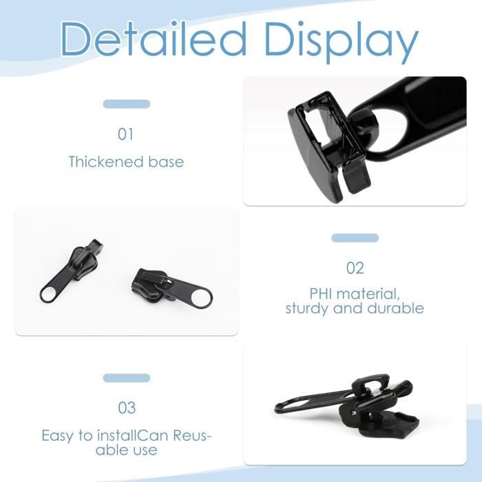 Notre kit de réparation de fermeture éclair universel permet de gagner du temps et est pratique grâce à sa conception facile à installer et durable. Polyvalent et pratique : adapté aux femmes au foyer ou aux bricoleurs, ce kit est un incontournable pour entretenir et prolonger la durée de vie de vos objets préférés. Marre des fermetures éclair cassées ? Ce kit de 105 pièces te sauve la mise ! Avec des curseurs en métal et nylon pour les tailles #3, #5, #8 – ça couvre... Gardez vos vestes, sacs à dos, valises et plus fonctionnels et prêts à l'emploi. Les réparations sont amovibles et réutilisables, donnant une durée de vie plus longue à vos vêtements, sacs ou chaussures. Dites adieu à la frustration et bonjour à une utilisation sans tracas ! Aucun outil supplémentaire n'est requis, ce qui le rend pratique à utiliser. Facile à installer sans aucune compétence en couture, il vous fait gagner du temps et de l'argent. Solution de réparation facile : réparez toute fermeture éclair cassée en quelques minutes avec ce kit de réparation de fermeture éclair. Dotée de 6 tirettes de rechange en 3 tailles, cette solution polyvalente s'adapte à différents types et tailles de fermetures éclair. Kit de réparation de fermeture éclair en métal détachable, 5 Kit De Réparation Fermeture éclair Tirette Fermeture éclair 6 Pièces Curseurs Fermeture Éclair Amovibles - Kit Réparation Zip Pour Vêtements, Sacs, Valises Curseurs Fermeture éclair Amovibles Réparation Fermeture éclair Leroy Merlin Livré avec une jauge de fermeture à glissière et des instructions détaillées pour les types et tailles de fermeture à glissière.