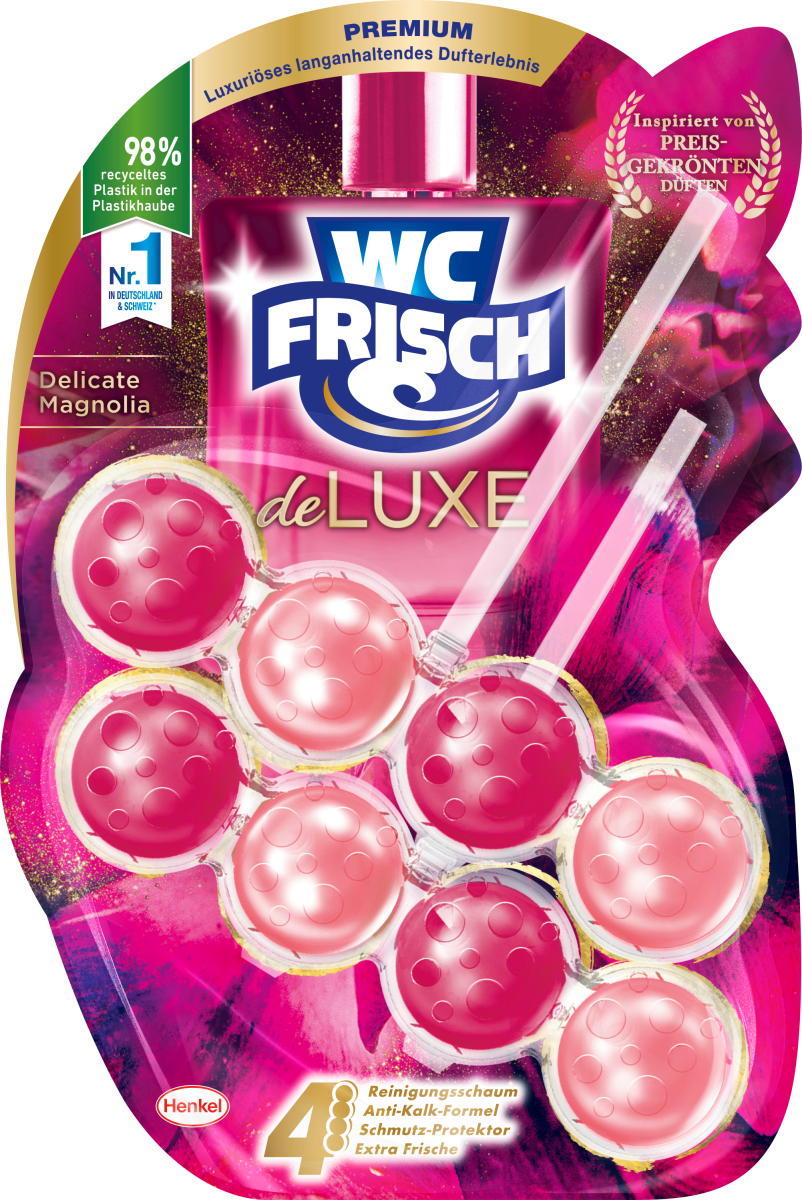 La marque WC Fresh WC FRISCH, l'expert du nettoyage des toilettes, offre de nombreuses solutions pour vous faciliter la vie dans le domaine de la propreté et de la fraîcheur dans vos toilettes. Depuis le lancement de la première pierre WC en 1968, WC FRISCH n'a jamais cessé de révolutionner le marché des nettoyants et désodorisants pour toilettes. Facile à utiliser – Après avoir retiré le film en aluminium, le WC FRISCH DeLuxe peut être accroché au bord de la piscine. Blocs WC Frisch DeLuxe Jasmine 2x50g (100g) acheter à prix réduit La formule se compose d'une combinaison de 4 agents actifs : le parfum noble donne un parfum durable, frais et élégant dans la salle de bain, la mousse nettoyante active assure un nettoyage à chaque rinçage, la formule anti-calcaire empêche la formation de calcaire et la protection contre la saleté empêche la formation de nouvelles salissures. Perles de parfum – Grâce à sa formule améliorée avec des perles de parfum, le liquide de toilette DeLuxe libère un parfum durable à chaque rinçage WC FRISCH DeLuxe Royal Orchid (50 g), nettoyant WC au parfum délicat d'orchidée, pierres parfumées avec perles de parfum pour un boost de parfum à chaque... Pour un monde propre avec WC frais Expérience de parfum de qualité supérieure - Inspiré par des parfums raffinés, ce diffuseur de parfum de toilette est comme un parfum pour les toilettes Ingrédients 30 % tensioactifs anioniques 5 - 15 % tensioactifs non ioniques contient des parfums Linalool Limonene Alpha-isomethyl ionone Pour une toilette entièrement nettoyée avec chaque chasse d'eau WC Frisch DeLuxe Magic Moonflower 3x50g (150g) günstig kaufen Diffuseur De Parfum Pour Wc WC FRISCH DeLuxe Royal Orchid Nettoyant WC Et Désodorisant WC - 1 Parfum Wc Les produits WC FRISCH vous aident à garder les toilettes propres et fraîches – jusqu'à 4 semaines.