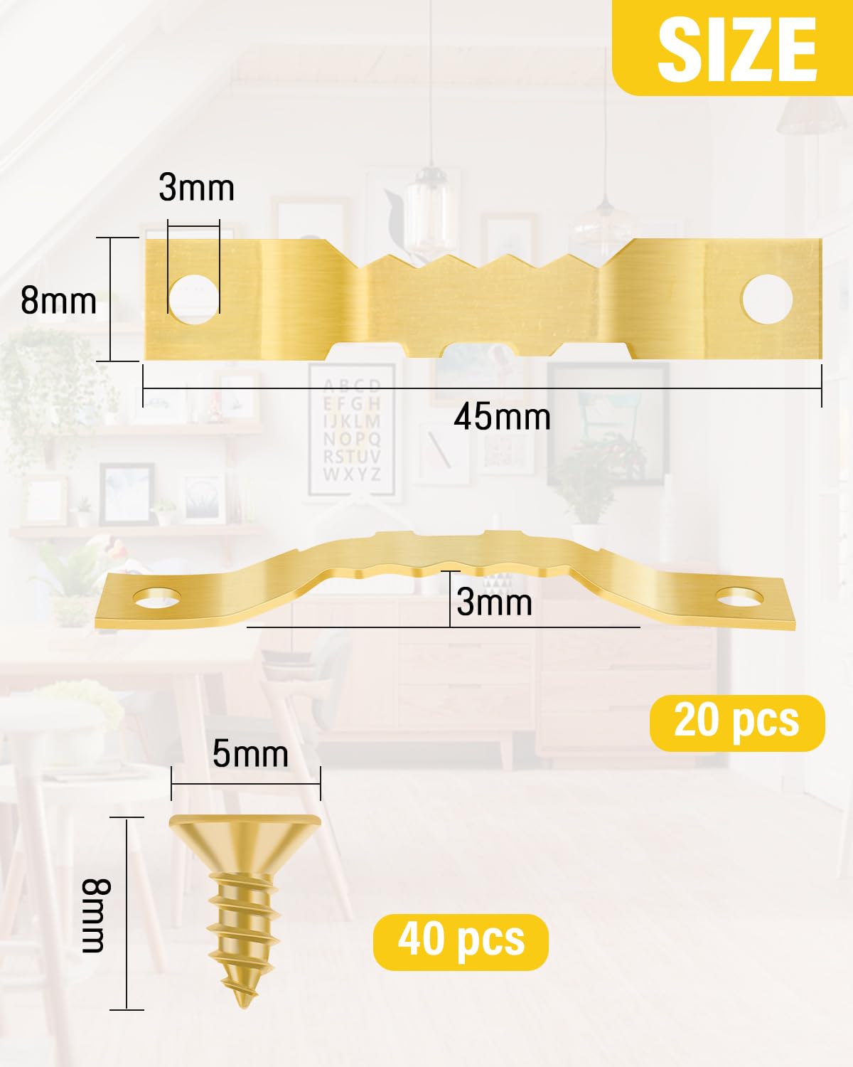 Caianwin Lot de 20 crochets de suspension en dents de scie pour accrocher des photos, des cadres photos, des peintures, des œuvres d'art, des horloges. Facile à installer : lorsque vous l'utilisez, percez d'abord des trous à l'arrière du cadre photo au bon endroit, puis placez les vis sur les crochets en dents de scie et serrez-le, puis vous pouvez accrocher le cadre photo au mur en toute sécurité. Caractéristiques : Matériau : acier inoxydable. La conception robuste peut supporter jusqu'à 9 kilos, ce qui lui permet de transporter en toute sécurité des cadres photo lourds, des toiles et d'autres œuvres... Facile utiliser lors de l'utilisation, placez les crochets du cadre photo l'arri re du cadre photo au bon endroit, vous pouvez percer des trous et le fixer au support du cadre photo avec des vis. Quantit d'emballage le kit de suspension pour cadre photo comprend 251 pi ces, 50 crochets en dents de scie, 50 crochets triangulaires en D, 150 vis assorties et 1 mini tournevis. Les crochets pour cadre photo ont une forme dentelée et peuvent être déplacés d'un côté à l'autre pour ajuster la position de la photo et de la peinture afin que la peinture soit parfaitement suspendue. Crochet Francais Lot De 20 Crochets En Dents De Scie Avec Vis, Petits Crochets Crochet X Tableau Quantité d'emballage : le lot comprend 20 crochets en dents de scie et 20 vis assorties, un nombre suffisant pour sécuriser de manière fiable votre cadre photo. Taille : comme sur l'image., Couleurs : noir. Les adoptions de la... - Les petits crochets de Jasmin