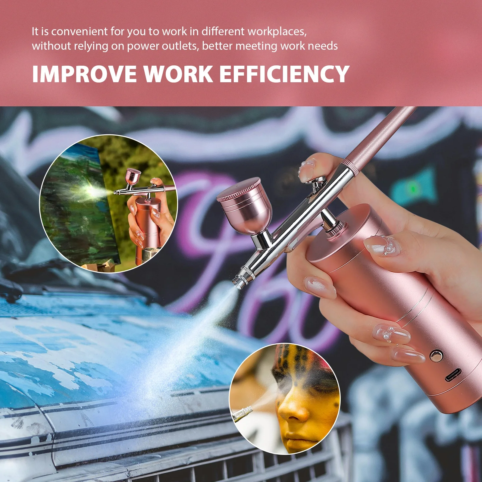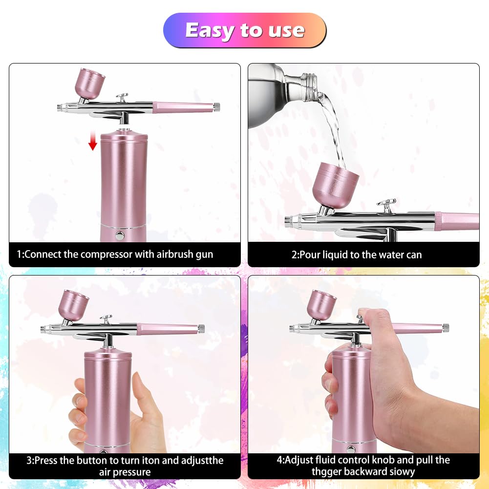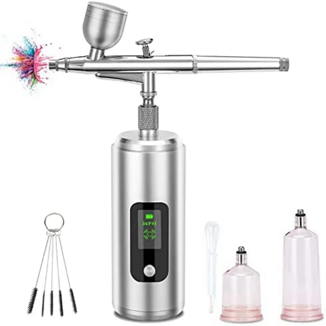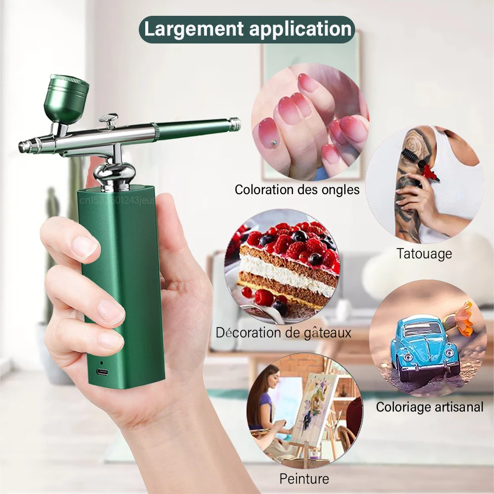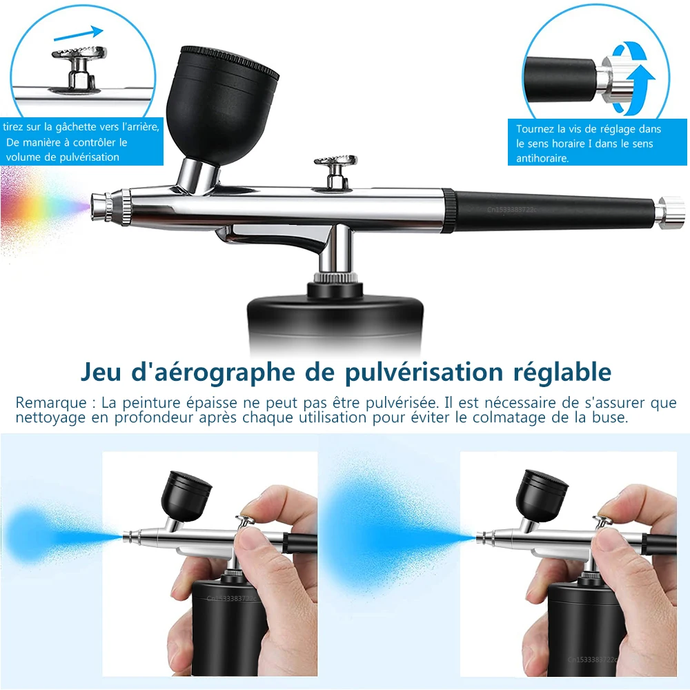 L'aérographe a une buse de seulement 0,3 mm, de sorte qu'il ne peut pulvériser que des aquarelles, des encres et des peintures correctement diluées. [Rechargeable par USB] Le kit aérographe est livré avec un câble de charge USB qui prend en charge la technologie de charge rapide 2 A, il est recommandé de le charger via un chargeur DC 5 V-2 A pour une vitesse plus rapide. Design exquis : cet aérographe a une apparence élégante sans ouvertures dans le corps. L'aérographe portable sans fil peut être utilisé pour la peinture, la décoration de gâteaux, le maquillage, le nail art, le coloriage de modèles, etc. Kit D'aérographe Avec Compresseur D'air, Pistolet Aérographe Sans Sortie d'air par minute : 10 l/min., Pression maximale : 27 psi. Capacité de la batterie : 1000 mAh. Léger et facile à transporter. Caractéristiques : Matériau : aluminium., Sortie : 3,7 V, 2 A. Après des tests répétés, il optimise non seulement le câblage, mais améliore également la durée de vie de la pompe à air. Batterie intégrée de 1000 mAh, temps de fonctionnement jusqu'à 1 à 1,5 heure lorsqu'elle est complètement chargée. Sans fil et léger, ce kit est pratique et s'utilise facilement : les trois réservoirs interchangeables se visent facilement au pistolet et permettent de répondre à tous les besoins 1 mini compresseur d'air., 1 tasse de 5 ml., 1 tasse de 40 ml., 1 burette. Aerographe Alimentaire Patisserie Mini Kit D'aérographe Avec Compresseur À Air Portable, Brosses À Air Kit Aérographie Leroy Merlin Kit aérographe avec copresseur sans fil - Kit aérographe portable... Si les peintures et les liquides sont trop épais, diluez-les avec de l'eau ou du diluant., 4., Après chaque utilisation, nettoyez soigneusement la tasse de liquide et la buse avec de l'eau ou du solvant en temps opportun, et ne laissez pas les pigments sécher, car cela pourrait provoquer l'obstruction de la buse., 5., Après 30 minutes de fonctionnement continu, le compresseur d'air doit être éteint pendant quelques minutes pour refroidir., 6., Utilisez des bases de maquillage à base d'eau au lieu de bases de maquillage à base d'huile. Il n'est pas recommandé d'utiliser l'aérographe pendant la charge. 1 câble de charge USB., 5 brosses de nettoyage., Remarque : 1., Avant d'utiliser des peintures ou des couleurs, testez le kit aérographe avec de l'eau pour vous assurer que l'aérographe n'est pas bouché., 2., Si l'aérographe ne distribue pas de liquide, le bouton de contrôle du liquide peut être trop serré ou la buse peut être bouchée. Diamètre de la buse : 0,3 mm. Chargez complètement l'aérographe avant de l'utiliser.