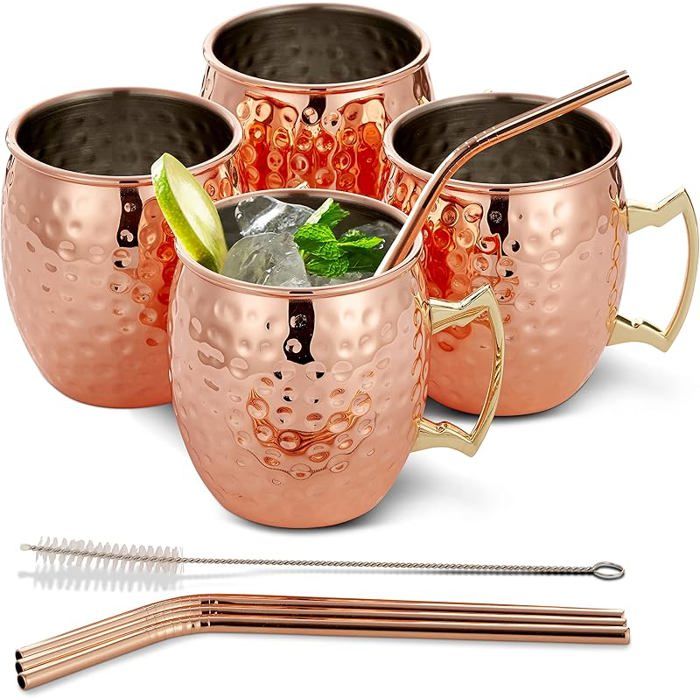 Facile à rincer et à nettoyer, conçu pour durer des années de perfection de cocktail froid. ✅ Revêtement résistant au ternissement pour une brillance durable. Idéal pour la vodka, la bière de gingembre et le citron vert, ainsi que les mojitos, les juleps de menthe, le café glacé, l'infusion froide ou la bière. Un cadeau aussi fonctionnel que beau. GoodyGoods oscow ule Tasses en cuivre : Rendez vos boissons beaucoup plus savoureuse! Coffret Parfait pour les bars à domicile, les occasions spéciales ou comme cadeau attentionné pour les amateurs de cocktails. La finition en cuivre naturel développe une belle patine au fil du temps, ce qui rend chaque tasse unique. 🎁 Un cadeau de qualité supérieure : que vous soyez un hôte, que vous vous détendiez ou offrez, cette tasse est un favori fonctionnel et favori de la conversation. Découvrez le goût authentique d'une Moscow Mule avec les tasses en cuivre NZM qui allient style et fonctionnalité. 💪 Étanche, durable et facile à nettoyer. Nous appliquons une laque de protection spéciale à l'extérieur pour aider à prévenir le ternissement et maintenir la brillance brillante de la tasse avec un minimum de polissage. Tableau émaux Helca Finition magnifiquement martelée : fabriquée à la main et unique. Tasse En Cuivre Pur NZM Tasse (473,6 G), Finition Lisse En Cuivre | Tasses En Moscow Mule Chaque tasse est unique avec son motif martelé réalisé à la main par des artisans. Le cuivre a cette capacité incroyable à garder vos boissons bien fraîches... Contrairement à de nombreux concurrents, nous proposons du cuivre véritable pour un maximum de goût et de bienfaits pour la santé. Profitez de vos boissons préférées avec bien-être à chaque gorgée. Chaque tasse est martelée à la main par des artisans qualifiés, lui donnant un superbe look vintage et une sensation texturée qui se démarque sur n'importe quel bar, étagère de cuisine ou table de fête. Lavage à la main recommandé pour préserver la beauté naturelle du cuivre. Dispose d'une poignée soudée et résistante aux fuites et d'un revêtement laqué de qualité alimentaire qui résiste au ternissement.