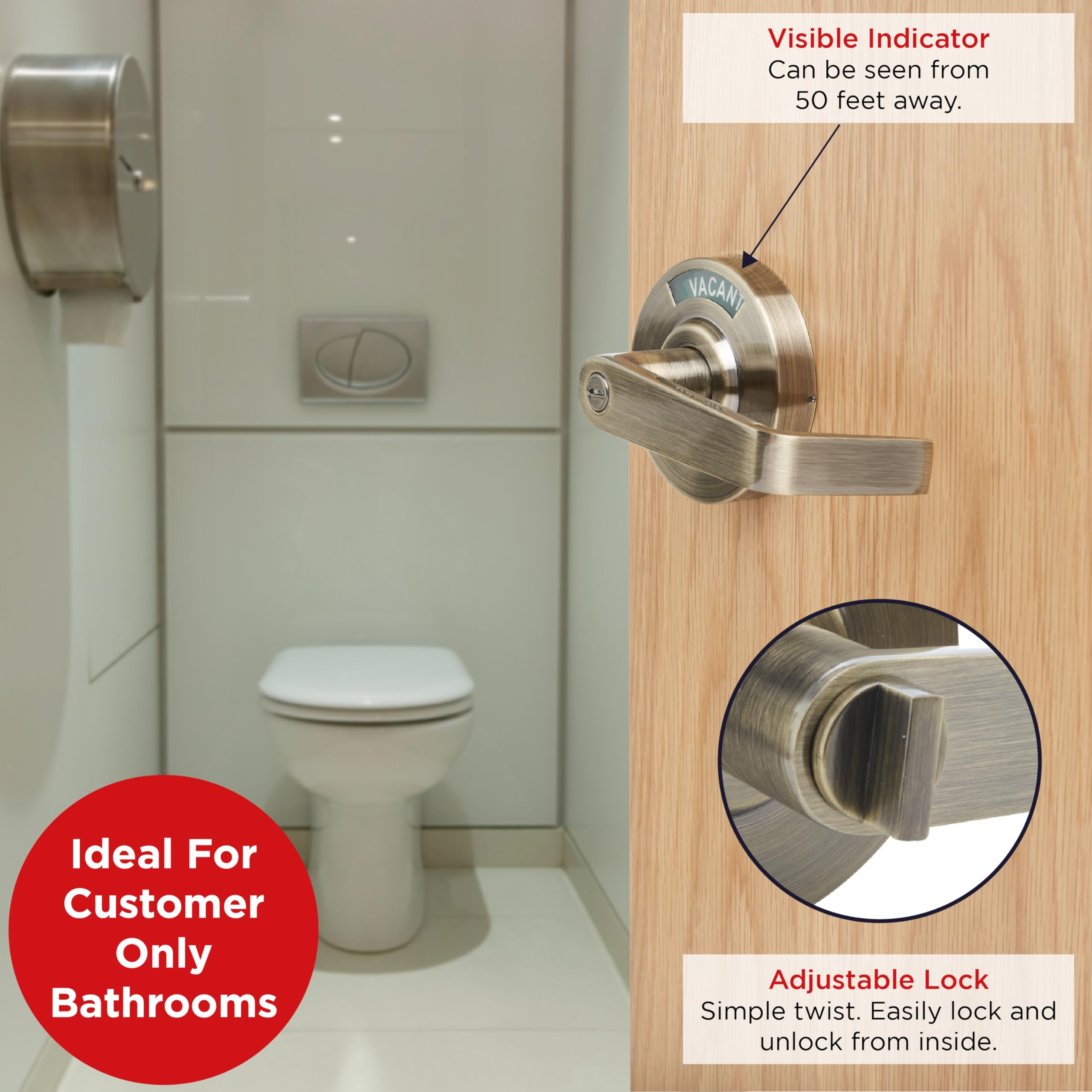 Sa surface en acier inoxydable durable résiste à une utilisation intensive, reste hygiénique et facile à nettoyer. La serrure s'adapte aux portes standard (de 1 3/8 pouces à 2 pouces d'épaisseur) et offre un processus d'installation sans tracas. Design facile à utiliser : idéal pour une gamme de paramètres tels que les restaurants, les bureaux, les installations médicales, les gymnases et plus encore, notre serrure de porte de salle de bain commerciale offre une expérience facile à utiliser. Serrure de porte, indicateur occupé, toilettes, Dr... – Grandado Ce cadenas avec affichage transparent « vacant » ou « occupé » garantit intimité et facilité. Nous sommes fiers de fournir des poignées de porte de haute qualité soutenues par notre garantie de 2 ans leader de l'industrie, assurant la tranquillité d'esprit de nos clients. SERRURE DE PORTE mobile salle de bain serrure de porte salle de bain... S'adapte aux gauchers ou aux droitiers et peut être facilement tourné pour une installation sans tracas. Installation facile, compatibilité polyvalente : conçu pour la plupart des portes standard (1 3/8 pouces à 2 pouces d'épaisseur), notre cadenas de salle de bain avec indicateur offre une installation déroulante avec un loquet de dossier réglable. Améliorez la fonctionnalité de votre salle de bain avec notre verrou de porte de salle de bain fiable avec indicateur d'occupation. Il suffit de tourner le bouton à l'intérieur pour verrouiller ou déverrouiller, et l'indicateur d'occupation « EN UTILISATION » ou « VACANT » s'affiche automatiquement en lettres faciles à lire. Distributeur de savon mural, 500 ml / 12 oz Distributeur de gel douche... Poignée Porte Salle De Bain Ancienne Indicateur De Serrure De Porte En Nylon Et Plastique Pour Toilettes Publiques, Poignée Noire Poignée Pour Porte Salle De Bain Son levier réglable s'adapte aux orientations gauchers ou droitiers, et une fonction anti-blocage assure la sécurité.