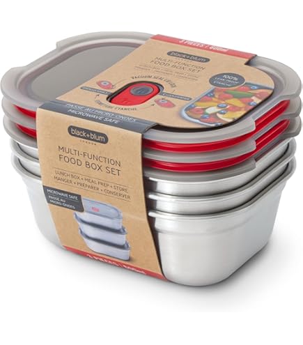 Fabriqué en acier inoxydable durable et polypropylène. Il suffit d'ouvrir la valve vapeur dans le couvercle et de veiller à ce que la boîte ne touche aucun autre métal. Les repas restent frais plus longtemps. KUGGIS bac avec couvercle, bleu-noir/bambou, 18x26x8 cm (7x10 ¼x3 ¼) Cette boîte brillante est pratique pour ranger des fournitures de bureau ou de petits accessoires multimédias. Grâce au couvercle, le contenu est protégé de la poussière. Il est aussi possible d'empiler facilement plusieurs boîtes Boîte Repas Ronde Hermétique - Inox Compatible Micro-Onde, Lave-Vaisselle, Four et Congélateur - Couvercle Sécurisé - 950 ml - Gris/Rouge. Black Blum. À... Micro Onde Multifonction Boite Sous Vide Alimentaire BLACK BLUM Boîte Multifonction Ronde En Acier Inoxydable 950 Ml Passe Au Four, Au Micro-ondes, Au Congélateur Et Au Lave-vaisselle | Scellage Sous Vide Et Valve à Black Blum Lunch Box Scellage sous vide : le verrouillage dans le couvercle crée un vide qui garantit que le couvercle ne se détache plus et que la boîte à bento est 100 % étanche. Black Blum | Ensemble de 2 bols de préparation de repas en acier inoxydable | Réutilisables, durables, sans danger pour les aliments, respectueux de l'environnement, 100 % étanches, passent au micro-ondes, au four La combinaison du vide et de la double lèvre en silicone garantit qu'aucun peu du contenu de la boîte à repas pour adultes ne peut fuir. Passe au micro-ondes : cette boîte en acier inoxydable avec couvercle peut également être chauffée au micro-ondes. Pour toutes les occasions : que ce soit pour chauffer au micro-ondes ou au four ou congeler au congélateur, cette boîte à repas en acier inoxydable est sûre !, Passe au lave-vaisselle.