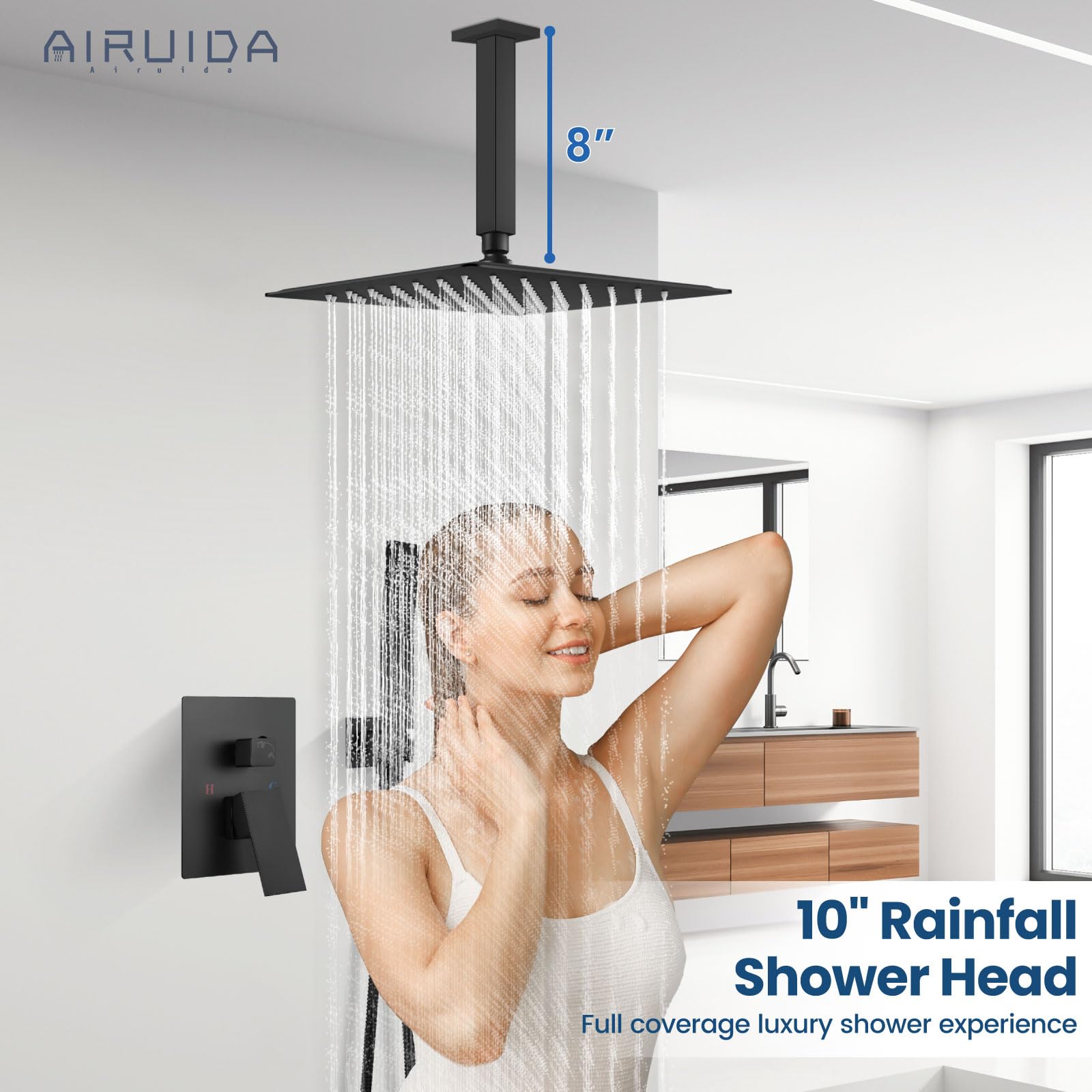 Matériau : pommeau de douche à effet pluie en acier inoxydable 304 de haute qualité et robinet mitigeur de douche en laiton massif, finition noire mate et combinaison en laiton anti-corrosion et anti-rouille, assurant durabilité et fiabilité. Livré avec des instructions d'installation claires (français non garanti). Airuida Système de douche mural de 25,4 cm - Noir mat Le pommeau de douche carré de 25,4 cm avec robinet est fabriqué en acier inoxydable 304 de haute qualité, assurant durabilité et fiabilité, tandis que la finition noire mate et la combinaison de laiton sont anti-corrosion et antirouille Installation : pommeau de douche à effet pluie et valve rugueuse. Pommeau De Douche Pour Ensemble Airuida Ensemble De Robinet De Douche Noir Mat, Système De Ensemble Pommeau Douche Leroy Merlin [Design] : bras de douche fileté NPT de 1,27 cm avec design de douche carré de 25,4 cm avec technologie de l'air. Poignée unique pour contrôler le débit d'eau et la température. Fonction : robinet de douche simple à fonction unique. Pommeau de douche avec 3 modes de pulvérisation, pommeau de douche avec...