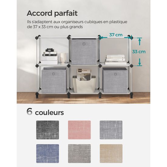 Durable et sans odeur : fabriquées en tissu aspect lin robuste, doublure en tissu Oxford et feuilles de plastique PP sans odeur, ces boîtes de rangement peuvent répondre aux exigences d'une utilisation quotidienne et fournir un environnement de rangement propre et frais Couleur. Noir d'Encre ; Matériau. Polypropylène (PP) ; Dimensions du produit. 30L x 30l x 30H centimètres ; Marque. SONGMICS ; Type de finition. Mat Dites adieu à la poussière et aux taches, pour un look propre et facile Cube Rangement SONGMICS Lot De 3 Boîtes De Rangement Enfant, Organisateurs De Jouets Casier De Rangement Utilisations polyvalentes : que ce soit dans votre chambre pour les vêtements, pour le bureau pour les livres, ou dans le salon pour les petits objets, ces boîtes de rangement pliables sont conçues pour répondre à vos différents besoins de rangement Différentes options s'offrent à vous pour la livraison ou le retrait de votre commande. Les options exactes disponibles pour cette commande sont visibles lors du paiement. Vendu par Areno 8,0 SONGMICS Cube Boîtes de rangement, lot de 4 pièces, 30 x 30 x 30 cm, 2 poignées, pliables, aspect tissu Oxford et lin, lavables, porte-étiquettes en métal, blanc nuage 34,95Vendu par : Areno... Lifewit Bacs de Rangement Cubiques Pliables, Paniers de Rangement Optimisez votre espace : conçus pour s'adapter parfaitement aux étagères cubiques de 30,5 cm ou plus, aux cloisons d'armoire et aux étagères à couches, ces cubes de rangement gardent vos effets personnels organisés. [Facile à nettoyer] Avec leur design lavable, le nettoyage de ces boîtes de rangement est un jeu d'enfant.