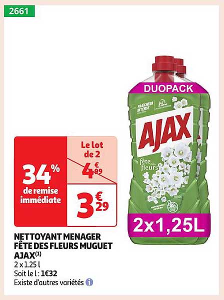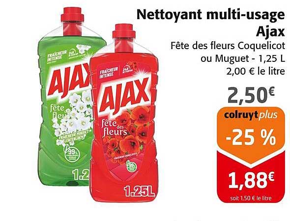 Promo Nettoyant Menager Ajax 1.25 L chez Rural Master Les indications ci-dessus sont données à titre d'information. AJAX Nettoyant liquide multi-surfaces fête des fleurs fraîcheur muguet 1,25l ... Nettoyant ménager. Provoque une sévère irritation des yeux. Tenir hors de... Ajax Vitre Nettoyant Ménager Sol Et Multi Surfaces Fête Des Fleurs Fraîcheur Produit Sol AJAX – Fête des fleurs Fraîcheur Muguet – Produit Ménager Sol & Multi Surfaces – À Utiliser Pur ou Dilué pour le Ménage de Toute la Maison – Sans Rinçage – Nouvelle Formule Écoresponsable – 1,25 L PRODUIT MÉNAGER POUR TOUTE LA MAISON : Ajax Fête des Fleurs est un produit ménager liquide, polyvalent et efficace, à utiliser pur pour désincruster les taches difficiles ou... Elles ne sont pas forcément exhaustives et ne sauraient se substituer aux informations figurant sur l'emballage du produit qui font seules foi, et auxquelles vous êtes invités à vous reporter, notamment en cas d'intolérance alimentaire., Le bidon de 1,25L