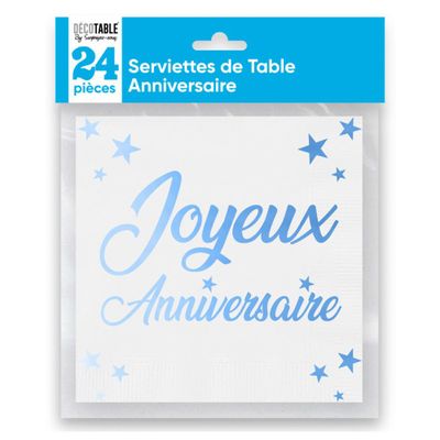 Coloris : Bleu, Turquoise, Ciel, Marine , Matière : JENCVNL 40 Pièces Serviettes Anniversaire Joyeux 33 x 33 cm Serviettes Papier Decoration Anniversaire, Serviette Jetable pour Deco,Scettar Serviette pour Fêtes (Bleu foncé Une couleur de serviettes d'anniversaire originale, qui attirera tous les regards ! Le paquet contient 24 serviettes d'anniversaire bleu électrique, qui mesurent 16,5x16,5 cm pliées et 33x33 cm dépliées. Elles sont personnalisées avec une inscription Joyeux Anniversaire couleur argent avec un effet métallisé, qui est entourée d'étoiles. Ces serviettes en papier d'anniversaire sont... Serviette Bleu Serviette De Table - SURPRISEZ VOUS - Joyeux Anniversaire - 24 Pièces Serviette Papier Anniversaire Enfant 24 Serviettes de table en papier Joyeux Anniversaire Fuchsia, vaisselle...