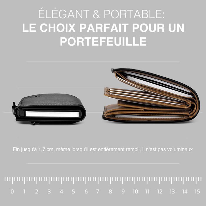 Grande capacité et organisation : peut contenir jusqu'à 12 cartes, offre un système organisé qui maintient vos documents en place, évitant le désordre. Taille compacte et légère : le design compact de ce porte-cartes se distingue par son minimalisme et sa taille réduite, idéal pour le transporter dans votre poche sans prendre de place. Emportez vos cartes et votre argent avec confort et style. Que ce soit pour les anniversaires, les anniversaires ou les célébrations spéciales, c'est un excellent choix pour les hommes et les femmes qui apprécient la praticité et le style. Porte Cartes RFID Blocage avec Coffret Cadeau | Votre Il est idéal pour ceux qui ont besoin d'un accessoire qui peut résister à l'usure quotidienne sans perdre son apparence. Dureté exceptionnelle : grâce à sa construction en alliage d'aluminium, ce porte-cartes est extrêmement résistant aux chocs et aux rayures, ce qui garantit une longue durée de vie. Cadeau idéal : son design élégant et fonctionnel en fait un cadeau parfait pour toutes les occasions. Fabriqué avec des matériaux de haute qualité, ce porte-cartes est conçu pour offrir une protection totale et un style unique. Dureté exceptionnelle : ce porte-cartes et porte-carte sont fabriqués en alliage d'aluminium de haute qualité, ce qui lui confère une résistance exceptionnelle aux chocs et aux rayures. Sa forme mince en fait le complément parfait pour ceux qui recherchent un porte-cartes fonctionnel et facile d'accès, sans renoncer à la capacité de stocker plusieurs cartes et billets. COMPACT ET FONCTIONNEL - Flexible pour modifier l'épaisseur du portefeuille métallique en fonction de votre besoin de stocker quelques ou un grand nombre de... Cela vous offre une couche de sécurité supplémentaire pour que vous puissiez être tranquille avec la protection de vos données. Porte Carte Aluminium Portecarte Homme Porte-cartes En Cuir Véritable - Design Minimaliste - Portefeuille Compact Homme Femme - Anti-RFID Portefeuille Minimaliste Porte Carte Bancaire Aluminium Son design classique qui vous permet de gagner de la place présente une pince à billets métallique robuste et six emplacements pour cartes. Cuir Nappa... Ce porte-cartes est l'équilibre parfait entre design, sécurité et organisation. Protection RFID : le porte-cartes dispose d'une technologie de protection RFID intégrée, ce qui empêche la numérisation non autorisée de vos cartes bancaires et documents personnels. Cadeau idéal : en plus d'être un accessoire pratique, ce porte-cartes est un choix de cadeau exceptionnel pour toutes les occasions. Protection RFID : intègre la technologie de protection RFID qui bloque l'accès non autorisé à vos cartes bancaires et autres documents personnels. Idéal pour ceux qui recherchent un porte-carte compact et robuste.