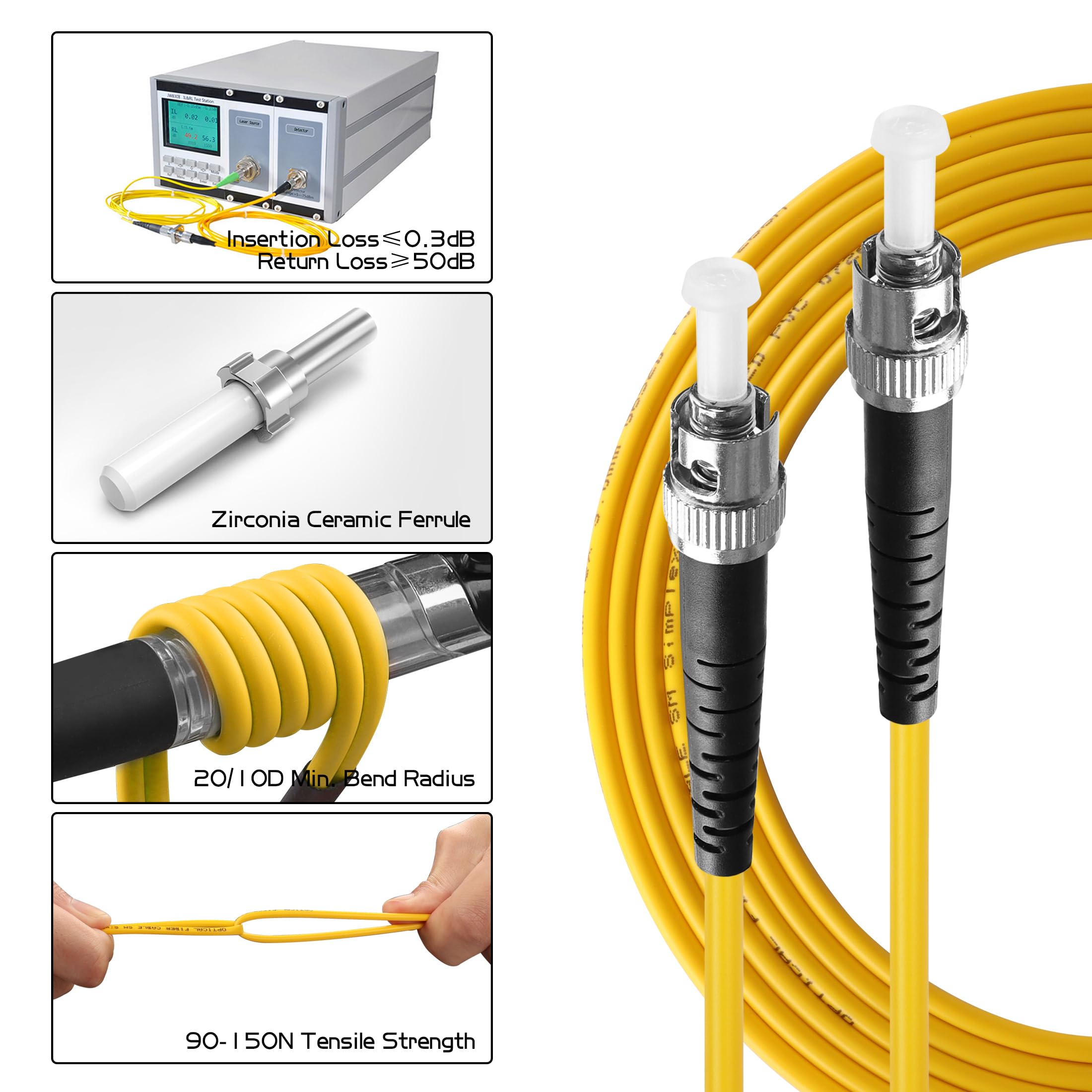 Modèle d'interface : ST - ST Longueur d'onde opérationnelle : 1310nm-1550nm Longueur d'onde opérationnelle : 1310nm-1550nm Longueur d'onde : 1310nm-1550nm Longueur d'onde : 2m Longueur d'onde : 3m Longueur : 2m Diamètre du câble : 3mm Diamètre du câble : 3mm Longueur d'onde : 10nm-1550nm Style de corps : Simplex Mode de fibre : Fibre monomode Température de fonctionnement : - 40℃ à + 75℃ La perte de retour : ≥ 50 %. Câble à fibre optique ST à ST simplex monomode 9/125 de 10 m OS2 Cordons de patch bidirectionnels multimodes et monomode, disponibles montés avec des combinaisons de connecteurs ST, SC et LC avec des cœurs de 9µm Il ne se décolore pas, ne se casse pas et ne se déforme pas facilement. Qualité supérieure : Les câbles de raccordement à fibre optique ST à ST sont fabriqués en PVC respectueux de l'environnement. Perte de retour : ≥ 50dB Perte d'insertion : ≥ 50dB Perte d'insertion : ≤ 0., 3dB Enveloppe : 2 x 2,5 cm de diamètre. Perte d'insertion ≤ 0,30dB aux longueurs d'onde de 1310 et 1550nm, perte de retour : ≥ 50dB. Large compatibilité : Ce câble de raccordement en fibre optique ST - ST est adapté aux applications Gigabit Ethernet, Fibre Channel, LAN, Data Center, Building Installation, Wan, Commercial et autres applications à haute densité, ce qui permet de répondre pleinement aux besoins des professionnels de la fibre optique. Informations sur la fibre optique : Fibre optique monomode de haute qualité 9/125um OS1 conforme à la norme ITU-T G. Le câble de raccordement est souple et robuste. Conviennent aux liaisons point à point simples dans des racks ou systèmes, ou comme câbles de patch. La gaine est en polymère sans halogène à faible risque incendie (LFH/LSOH) convenant à l'installation en bâtiment et est entièrement compatible avec tous les accessoires de gestion de câble standard Cable Optique Fibre YACSEJAO 2M ST Vers ST Câble Patch Fibre Optique Monomode Cable Fibre Optique Orange En outre, la combinaison de l'étrier de protection, de la douille de décharge de traction et de la douille en céramique de zircone du connecteur ST assure des performances fiables.
