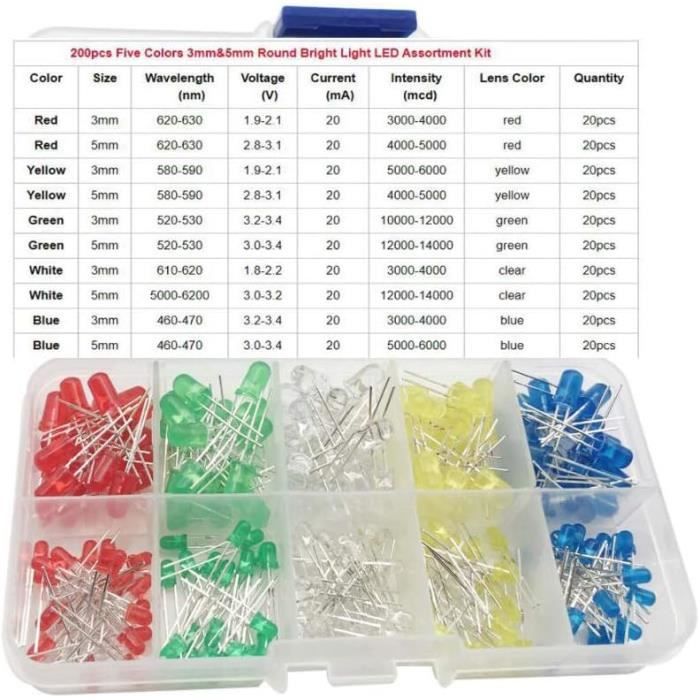Diodes lumineuses LED de 5 mm : 20 jaunes, 20 vertes, 20 bleues, 20 rouges, 20 blanches. Diodes électroluminescentes, Lot De 50 Diodes à Diode Commune, Vert Et Vous ne perdrez pas les couleurs lorsque vous travaillez sur le projet car les couleurs sont là sans les allumer Led Arduino Chiloskit Lot De 500 Petites Diodes LED Pour Arduino Blanc Diode Led Tension directe : R/Y 2,0-2,2 V ; B/G/W 3,0-3,2 V ; max., Courant : 20 mA. Expérience parfaite : ce lot de 500 petites diodes LED émet une faible consommation d'énergie, une plus longue durée de vie, une meilleure robustesse... Large application : vous pouvez les utiliser pour faire des projets de bricolage, des expériences scientifiques scolaires, des décorations de voiture, des expériences électroniques et électriques, etc. Longueur de la broche : 18 mm. Les lumières LED colorées sont tellement mieux que les lumières transparentes.